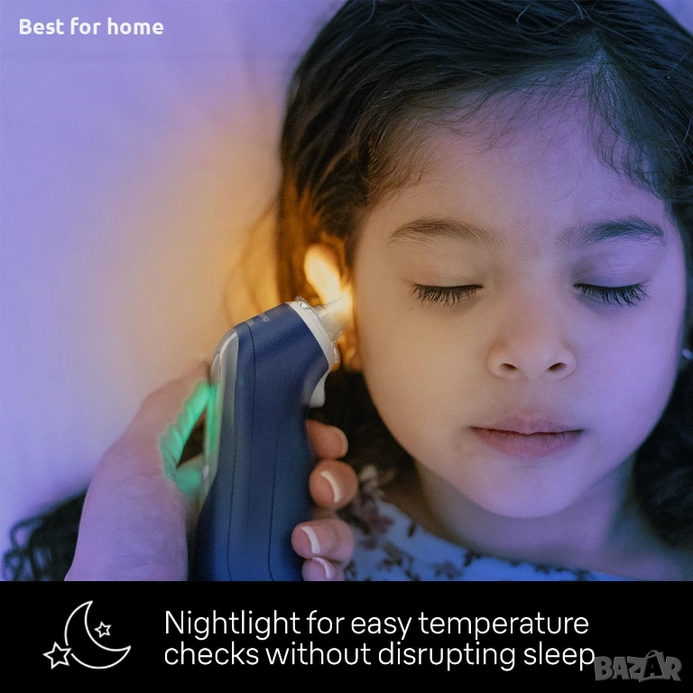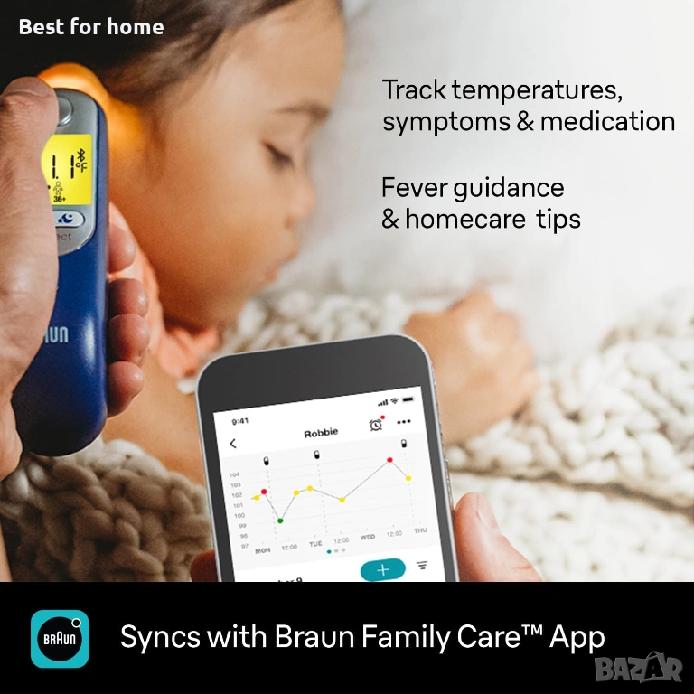 Марка № 1, препоръчвана от педиатри(1): Бебешкият термометър за ухо ThermoScan 7+ connect на Braun е клинично валидиран за точни показания за секунди и се сдвоява с приложението Braun Family Care, за да помогне за управлението на болестта на вашето семейство у дома.
