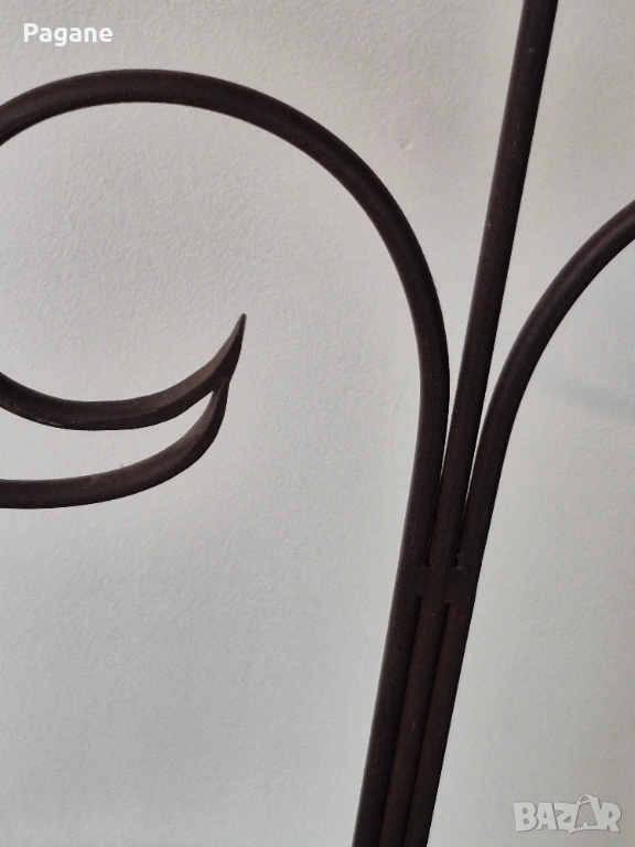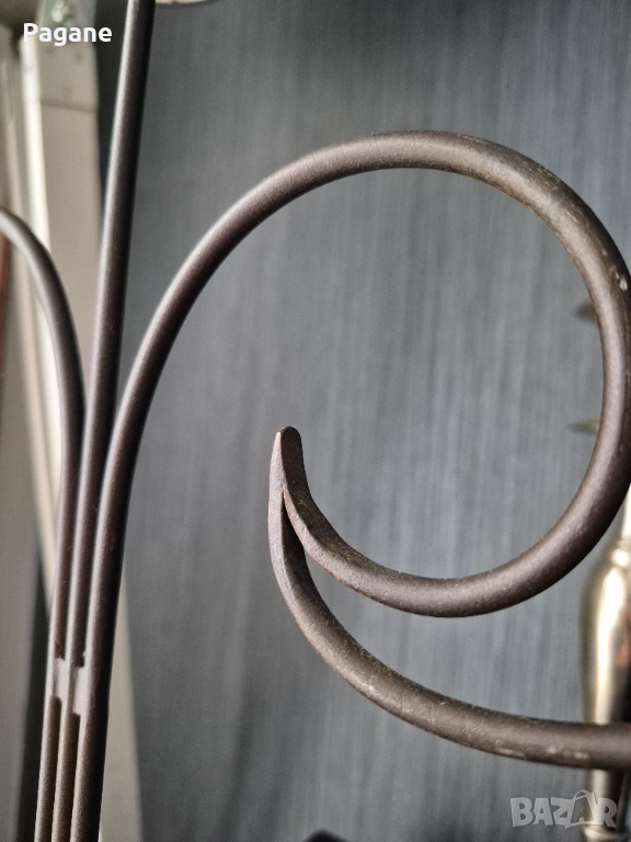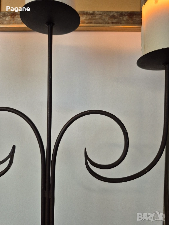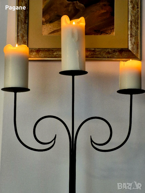 Продавам голям и стабилен трираменен свещник, изработен от желязо. Моделът е с изчистен и елегантен дизайн с извити елементи, вдъхновен от класическия стил на кованото желязо. Изключително подходящ за акцент в интериора на дома, за вила или заведение.