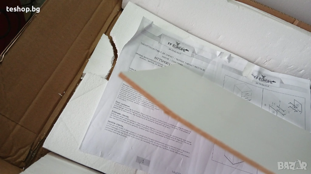 комплект от 2 броя нощни шкафчета с транспортен дефект - леко пречупено гръбче, но не е счупено и лека пукнатина на едната вратичка от вътрешната страна- след сглобяване забележките не се виждат.