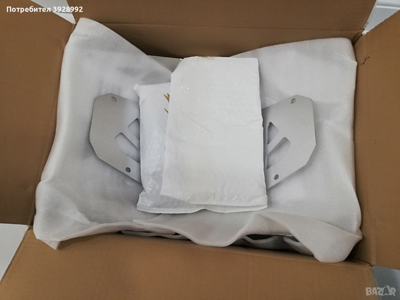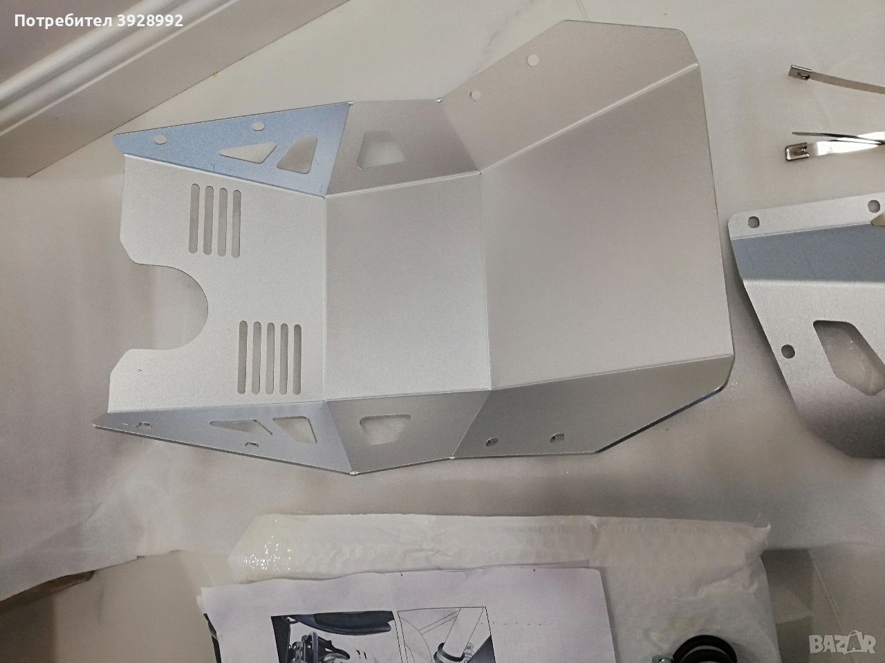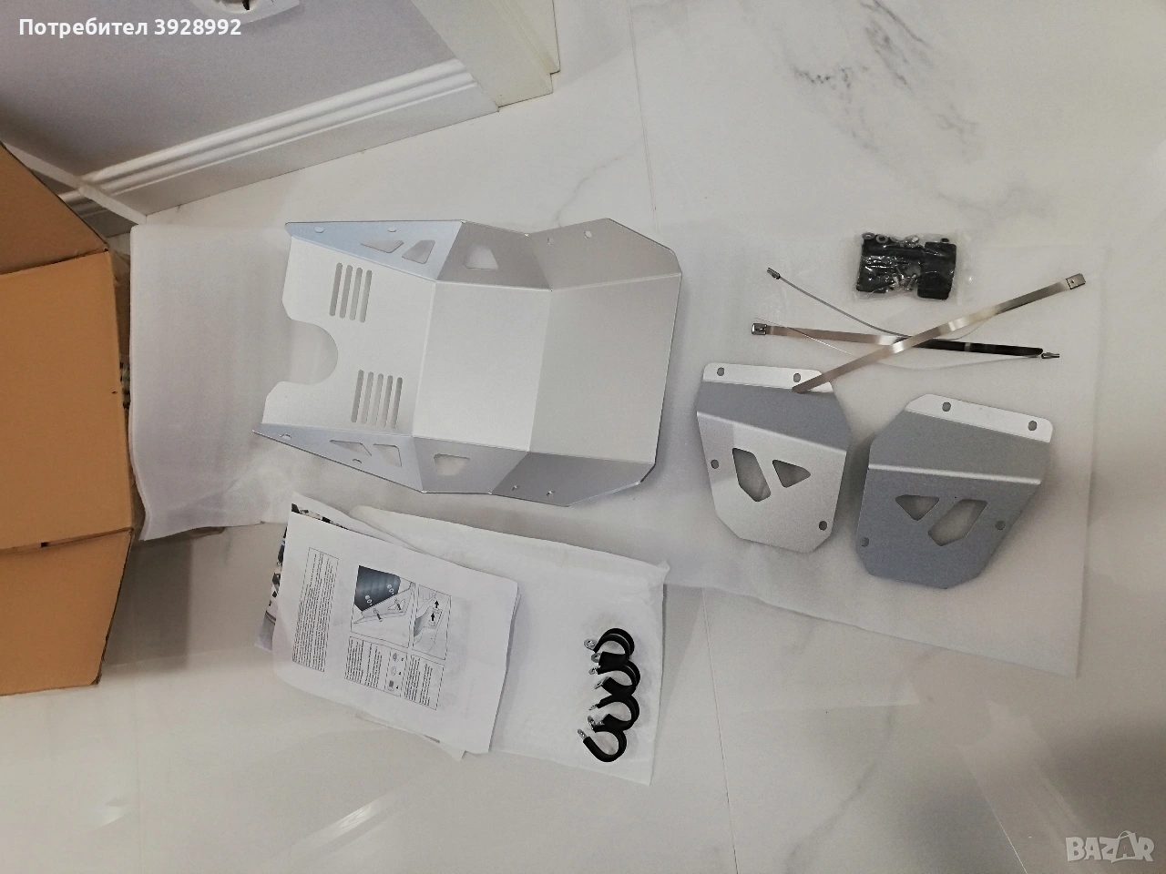 Алуминиева предпазна плоча (skid plate/bash plate) за двигател, предназначена за мотоциклети Suzuki. Продуктът е проектиран специално за следните модели: Suzuki V-Strom 1050XT Suzuki DL1050 Години на производство: 2020, 2021, 2022 и 2023 г. Това е защитен аксесоар, който се монтира под двигателя на мотоциклета. Основните му функции са: Защита на картера: Предпазва долната част на двигателя от удари с камъни, корени или други препятствия при каране извън пътя (off-road). Защита на изпускателните тръби: Покрива предната и долната част на изпускателната система, за да предотврати вдлъбнатини. Вентилация: На плочата се виждат прорези (отвори), които позволяват на въздуха да преминава и да охлажда двигателя, докато се движите. Характеристики на продукта Цвят: Сребрист (алуминиев финиш). Изработена от висок клас алуминий (около 3-4 мм дебелина), който е лек, но достатъчно здрав да поеме удари. Пакетът включва всички необходими болтове, скоби, втулки и кабелни превръзки за инсталация. Дизайн: Дизайнът е агресивен и съобразен с линиите на V-Strom 1050, като включва и странична защита на долните части на корите/двигателя. Ако планирате да карате своя V-Strom по черни пътища или лек офроуд, тази плоча е изключително важна. Фабричните пластмасови кори на V-Strom не предлагат почти никаква защита срещу сериозни удари. Алуминиевата плоча може да ви спести скъпи ремонти по двигателя или изпускателната система.