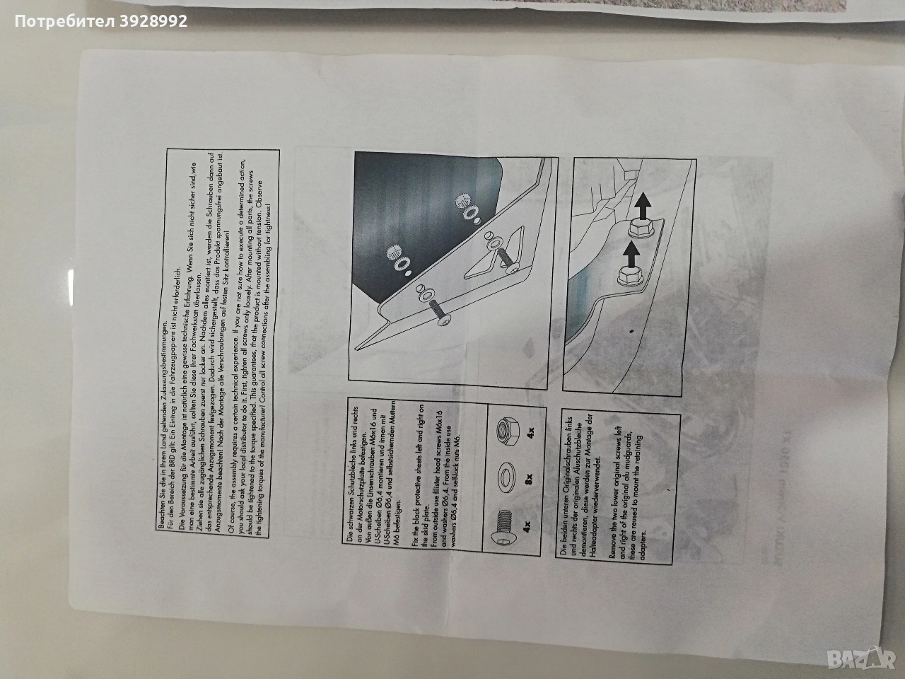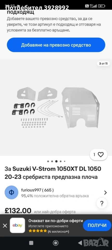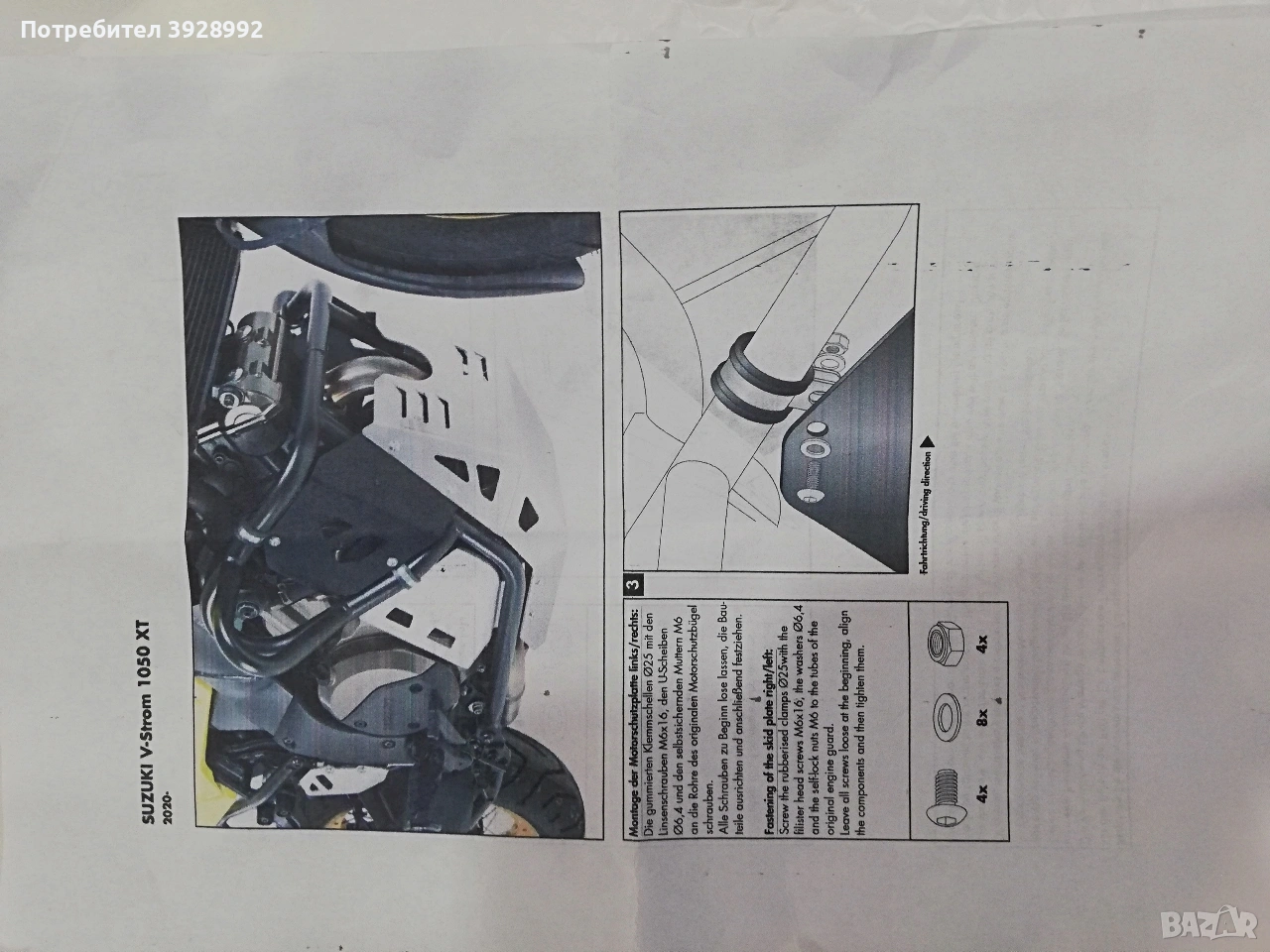 Алуминиева предпазна плоча (skid plate/bash plate) за двигател, предназначена за мотоциклети Suzuki. Продуктът е проектиран специално за следните модели: Suzuki V-Strom 1050XT Suzuki DL1050 Години на производство: 2020, 2021, 2022 и 2023 г. Това е защитен аксесоар, който се монтира под двигателя на мотоциклета. Основните му функции са: Защита на картера: Предпазва долната част на двигателя от удари с камъни, корени или други препятствия при каране извън пътя (off-road). Защита на изпускателните тръби: Покрива предната и долната част на изпускателната система, за да предотврати вдлъбнатини. Вентилация: На плочата се виждат прорези (отвори), които позволяват на въздуха да преминава и да охлажда двигателя, докато се движите. Характеристики на продукта Цвят: Сребрист (алуминиев финиш). Изработена от висок клас алуминий (около 3-4 мм дебелина), който е лек, но достатъчно здрав да поеме удари. Пакетът включва всички необходими болтове, скоби, втулки и кабелни превръзки за инсталация. Дизайн: Дизайнът е агресивен и съобразен с линиите на V-Strom 1050, като включва и странична защита на долните части на корите/двигателя. Ако планирате да карате своя V-Strom по черни пътища или лек офроуд, тази плоча е изключително важна. Фабричните пластмасови кори на V-Strom не предлагат почти никаква защита срещу сериозни удари. Алуминиевата плоча може да ви спести скъпи ремонти по двигателя или изпускателната система.