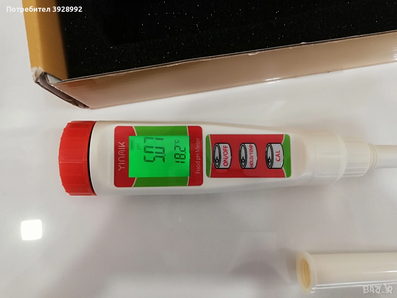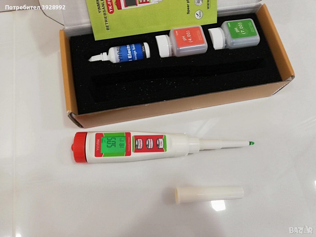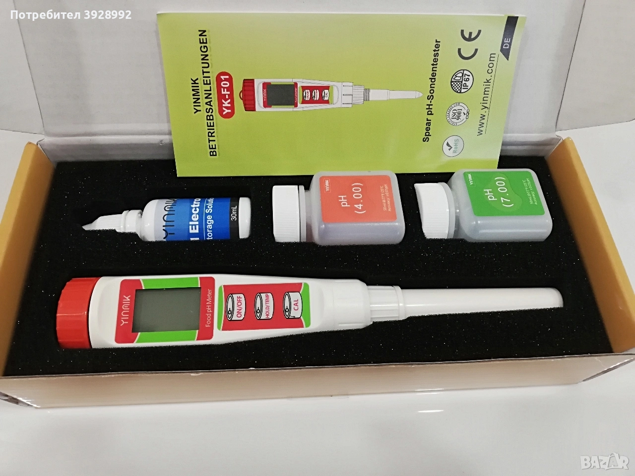 YINMIK YK-F01 е преносим електронен pH-метър с електродна сонда, предназначен за бързо и точно измерване на pH стойности в различни течности и храни. Подходящ е за приготвяне на квас. Чудесен за управление на ферментацията на квас и тестване при производство на колбаси, салам, сирене, консервирано сладко, ферментирали сосове, сос от черен пипер или салса и др.Може да измервате и рН дори на козметиката си. Препоръчва се както за домашна, така и за професионална употреба. Какво включва комплектът В кутията се виждат: Дигитален pH-метър (YK-F01) Буферен разтвор pH 7.00 (за калибриране) Буферен разтвор pH 4.00 (за калибриране) Разтвор за съхранение на електрода Инструкция за употреба (на немски/английски) Основни характеристики Обхват на измерване: pH 0.00 – 14.00 Точност: ±0.01 pH Резолюция: 0.01 pH Калибриране: Ръчно, двуточково (pH 4.00 и pH 7.00) Бутон CAL на корпуса Температурна компенсация: Автоматична (ATC) Дисплей: LCD екран с ясни цифрови стойности Управление: Бутони: ON/OFF, HOLD, CAL Захранване: Батерии (обикновено 2 × LR44 или подобни) За какво може да се използва Този уред е много универсален: Храни и напитки (вино, бира, сокове, мляко) Хидропоника и земеделие Аквариуми и рибарници Питейна и отпадна вода Лабораторни и учебни цели Домашно пивоварство и ферментация Предимства Компактен и лек Лесен за употреба Висока точност за ценовия клас Пълен комплект с калибрационни разтвори Подходящ и за начинаещи Чисто нов, отворен само за снимки