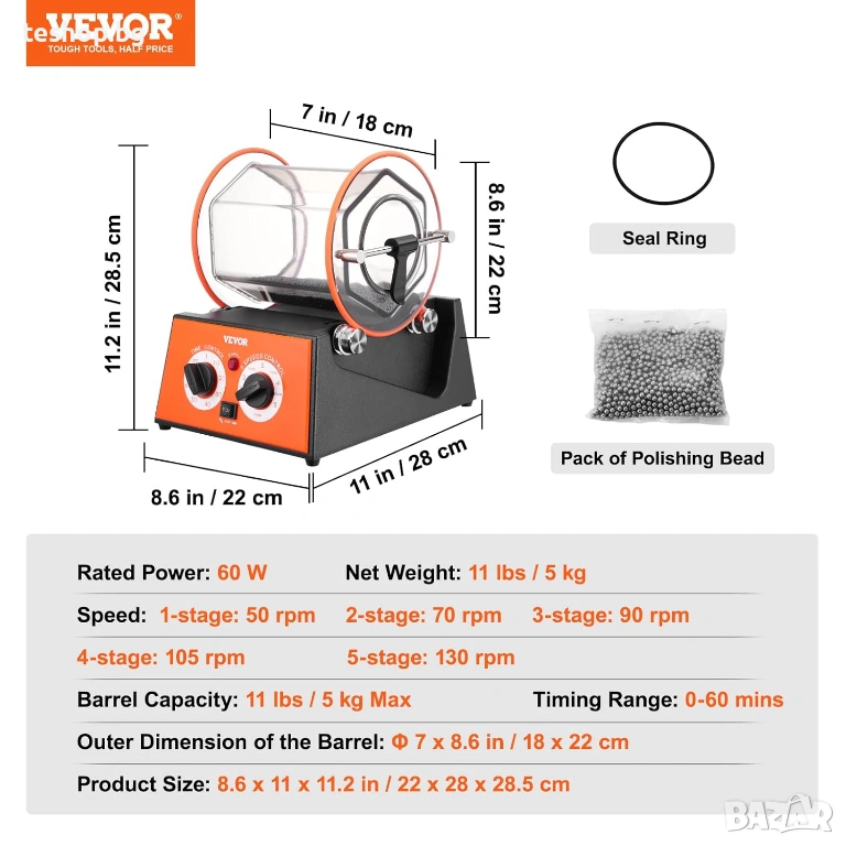 Надежден материал: Ротационният полиращ барабан от 5 кг, изработен от здрав поликарбонат, е водоустойчив и има дълъг живот. Новата структура на предавателния механизъм осигурява по-гладка и по-стабилна работа без опасност от счупване.