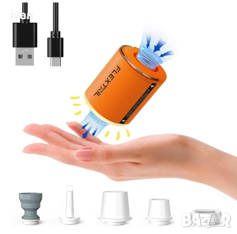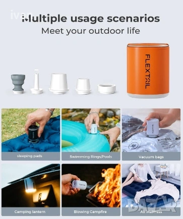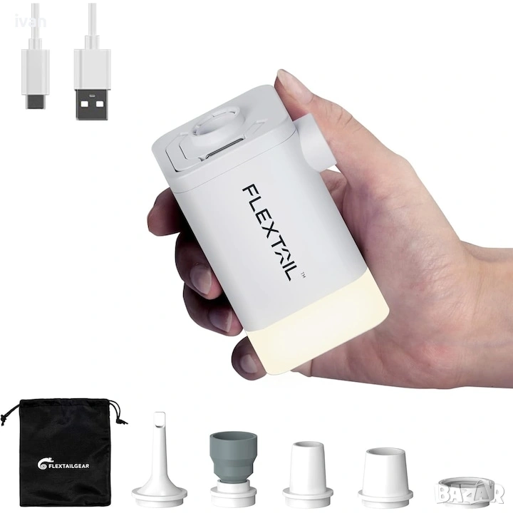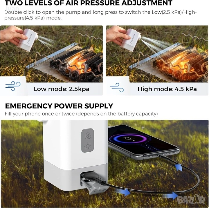 В вградена литиево йона батерия, която може да надуе до 10 единични дюшека с едно зареждане. С вградена мощна led светлина за палатка и осветление на открито. Водоустоичива Ip сертифицирана.