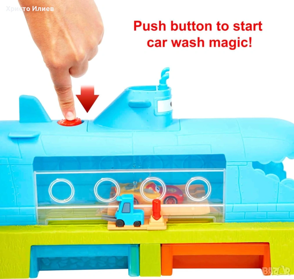 Автомивката Disney and Pixar Cars Color Change предлага на децата часове добро и чисто забавление с миене на автомобили! Lightning McQueen разкъсва пистата и се нуждае от помощ за почистване! Заредете Lightning McQueen, след това плъзнете помощника на мотокара, за да преместите състезателя през автомивката с форма на подводница. Спрей с топла вода променя външния вид на превозното средство, децата могат да гледат как промяната на цвета се случва точно пред очите им. След това го потопете в резервоара със студена вода и го гледайте как си възвръща първоначалният цвят отново!