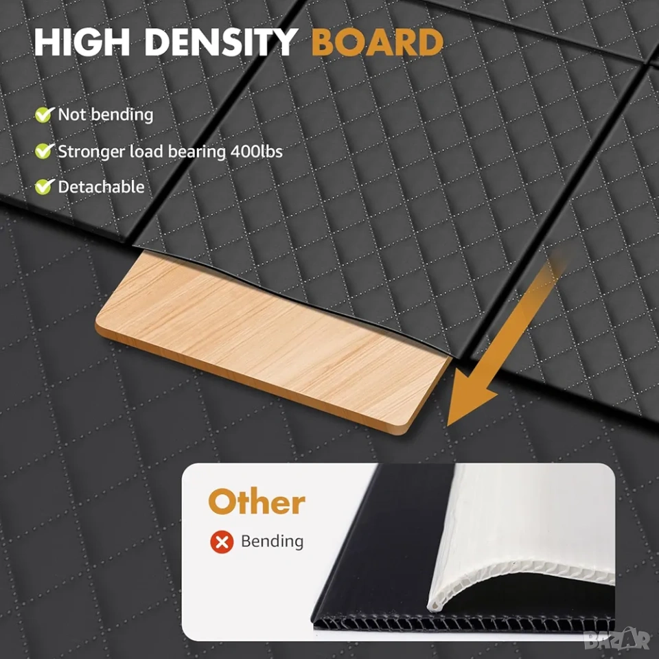 * Висока товароносимост: Благодарение на вградените усилени плоскости (композитно дърво/фазер с висока плътност), конструкцията издържа на натоварване до 180 кг (400 lbs), без да се огъва или деформира.