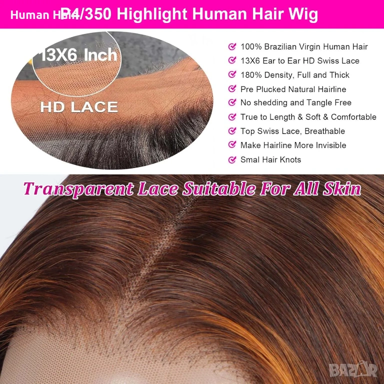Перуката е с дължина 60 см и права структура, което я прави изключително елегантна и лесна за поддържане. Дантелената зона 13х6 осигурява естествен вид на скалпа и позволява оформяне на пътя по желание.