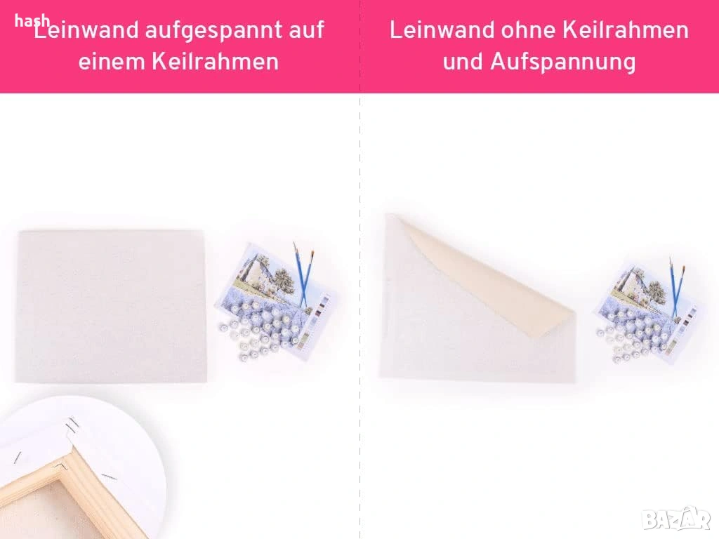 Можете да поръчате пълен комплект за рисуване по номера с рамка за подрамка. Комплектът включва предварително отпечатано платно, бои, 3 четки, 2 кукички и винтове за окачване на картината, лупа, цветен шаблон, неоцветен шаблон А3 и подробно ръководство на 6 езика. Платното вече е опънато върху рамката за подрамка и можете да започнете да рисувате веднага. Комплектът съдържа всичко необходимо за рисуване.
