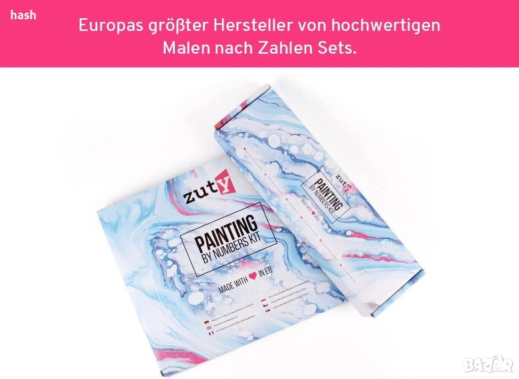 Zuty, европейският производител на бои по номера, предлага на своите клиенти висококачествени продукти и страхотно изживяване при рисуване. Ние гарантираме висок стандарт за качество в нашето производство и постоянно подобряваме продуктите си благодарение на дългогодишния ни производствен опит. Рисуването по номера е много популярно и Zuty предлага нови мотиви всеки месец за всички любители на изкуството. Нашата цел е да създадем перфектен продукт. Рисуването по номера е забавно и релаксиращо за всички. Не е нужно да имате никакъв опит, за да нарисувате красива картина. Нашите висококачествени комплекти за рисуване по номера са подходящи както за абсолютни начинаещи, така и за напреднали художници. Създайте произведение на изкуството, с което ще се гордеете и ще го покажете на семейството и приятелите си. Вземете пълен комплект за рисуване по номера. Нашите висококачествени комплекти за рисуване по номера съдържат всичко необходимо за рисуване: 1 предварително отпечатано платно, 3 четки, 1 комплект акрилни бои, 2 куки и винта за окачване на картината, 1 лупа, 1 цветен шаблон, 1 небоядисан шаблон A3, 1 подробна инструкция на 6 езика. И всичко е опаковано в красива подаръчна кутия. Нашите комплекти се характеризират с предварително отпечатани платна с ясно обозначени големи полета и символи, които не натоварват очите при рисуване. Не е необходимо да смесвате цветовете ни. Можете да изберете цял комплект за рисуване по номера със или без рамка за подрамка. Можете също така да изберете дали искате да нарисувате картина с размери 40 x 50 см или 80 x 100 см. Всеки първокласен комплект е произведен в Европа, с фокус върху качеството.