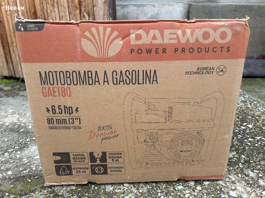 Бензинова помпа за чиста вода DAEWOO GAET80 е с мощност 6.5 к.с., напор 25 м, максимален дебит 56 м³/ч и вътрешен диаметър вход/изход 3". Тя е подходяща за източване на вода от басейни, водоеми и други източници на чиста вода, като максималната дълбочина на засмукване е 8 м. Оборудвана е с