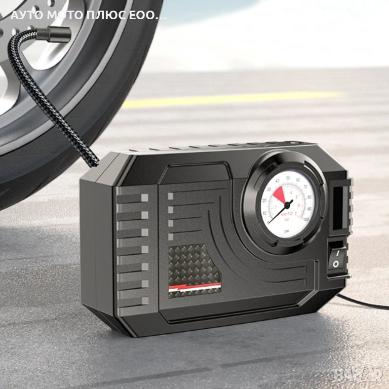 Kомпресор с манометър за помпене на автомобилни и велосипедни гуми, въздушни матраци и надуваеми принадлежности.