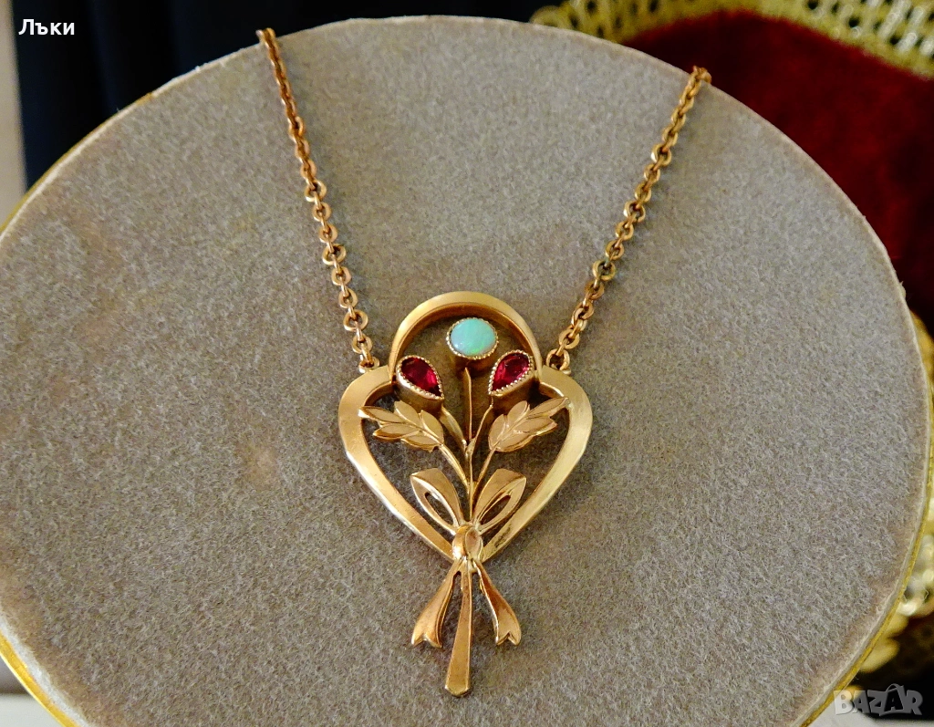 цветя в стил Art Nouveau с естествени скъпоценни камъни – етиопски огнен опал ръчно шлифован тип кабошон