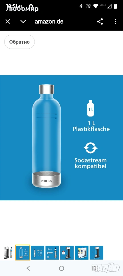 С три пластмасови бутилки от 1 литър без BPA и бутилка с CO2 за до 60 литра газирана вода, в зависимост от степента на карбонизация