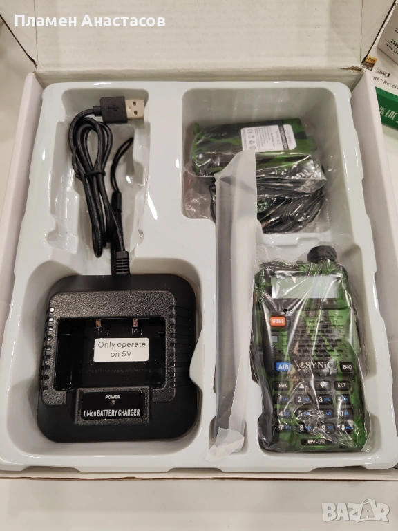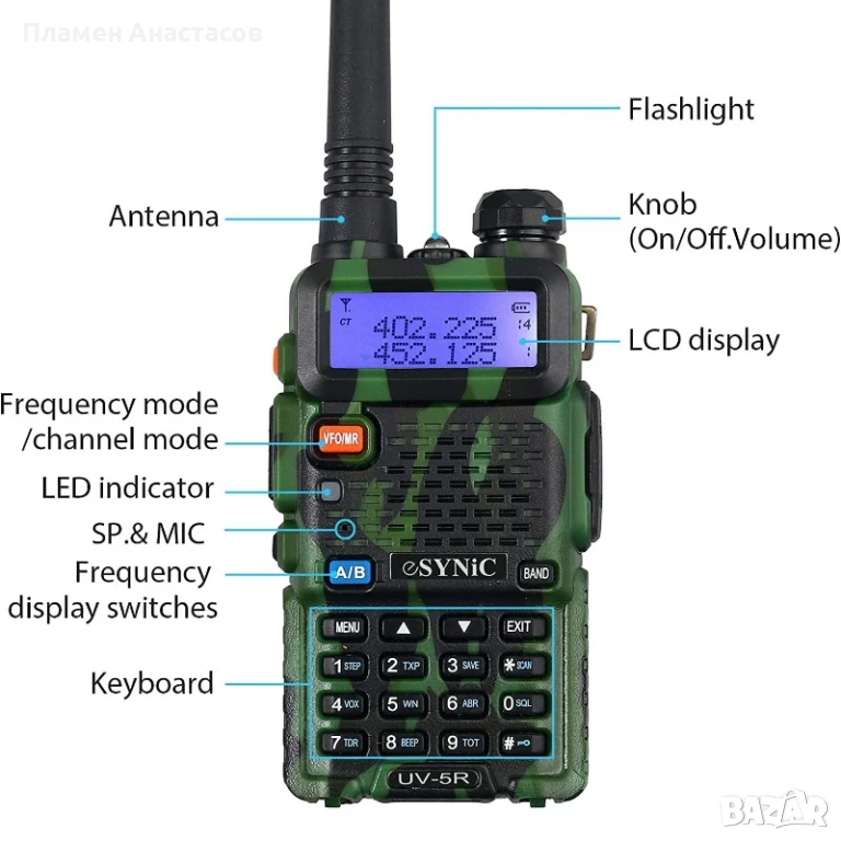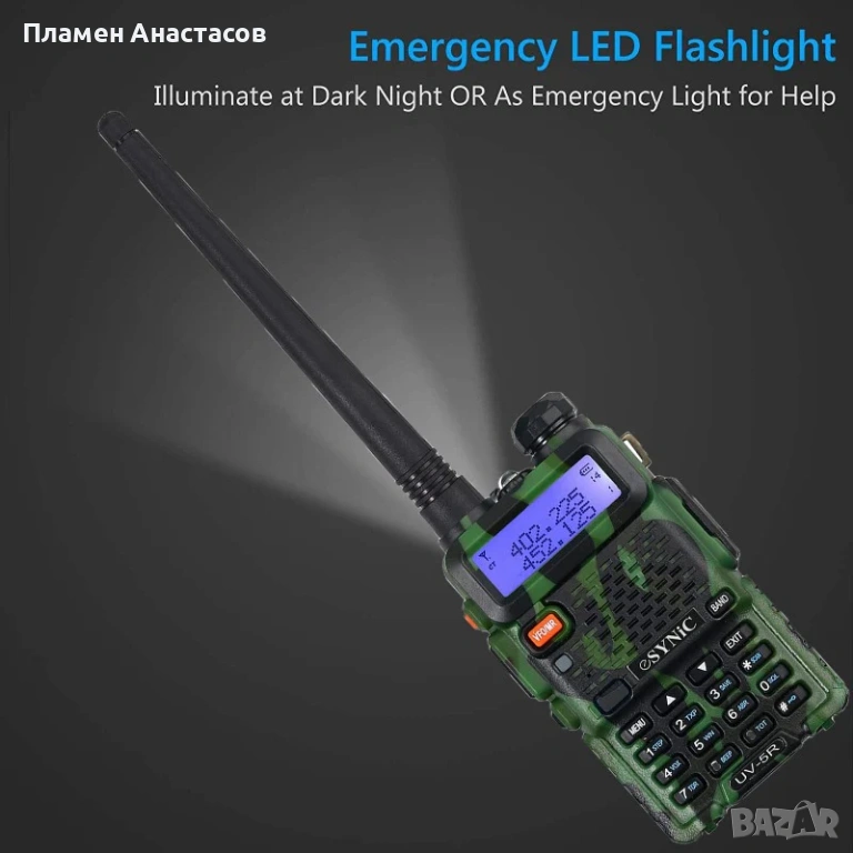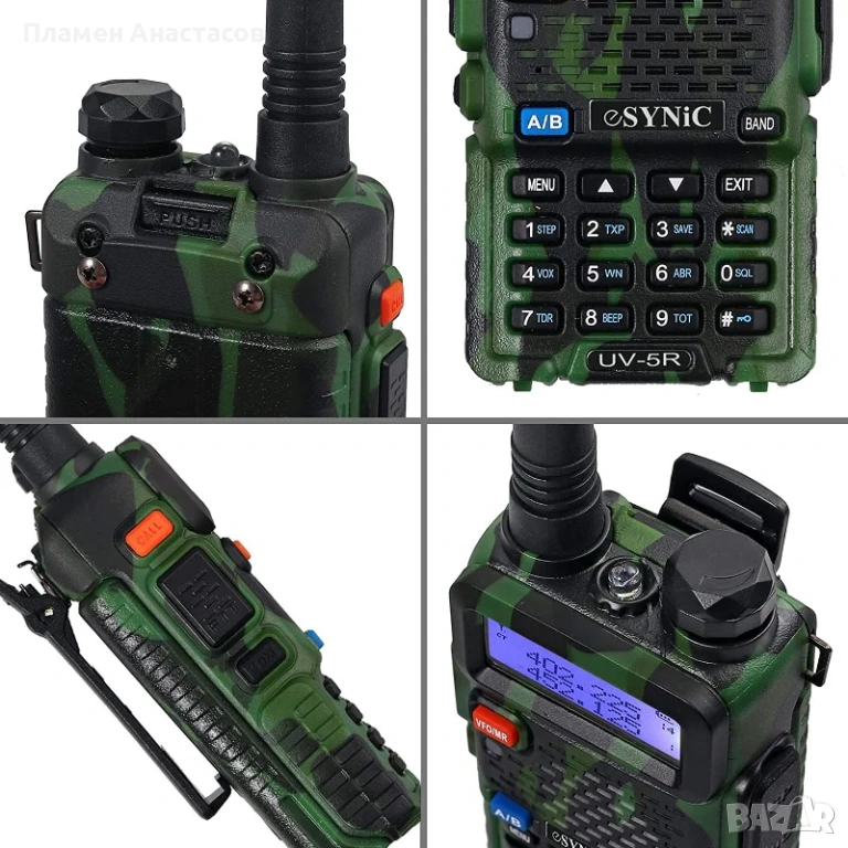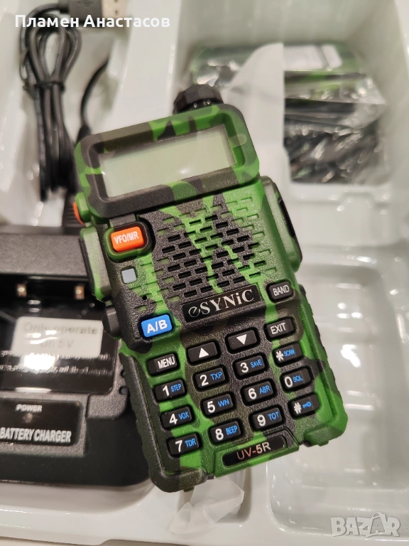 eSynic UV-5R е двубандова портативна радиостанция (walkie-talkie), предназначена за надеждна комуникация на открито. Работи в VHF и UHF диапазони, осигурявайки стабилен обхват и чист звук – идеална за лов, риболов, къмпинг, планински преходи, охрана или работа на терен.