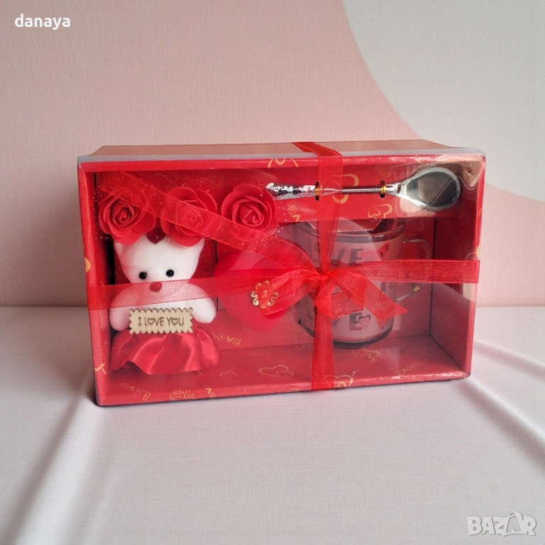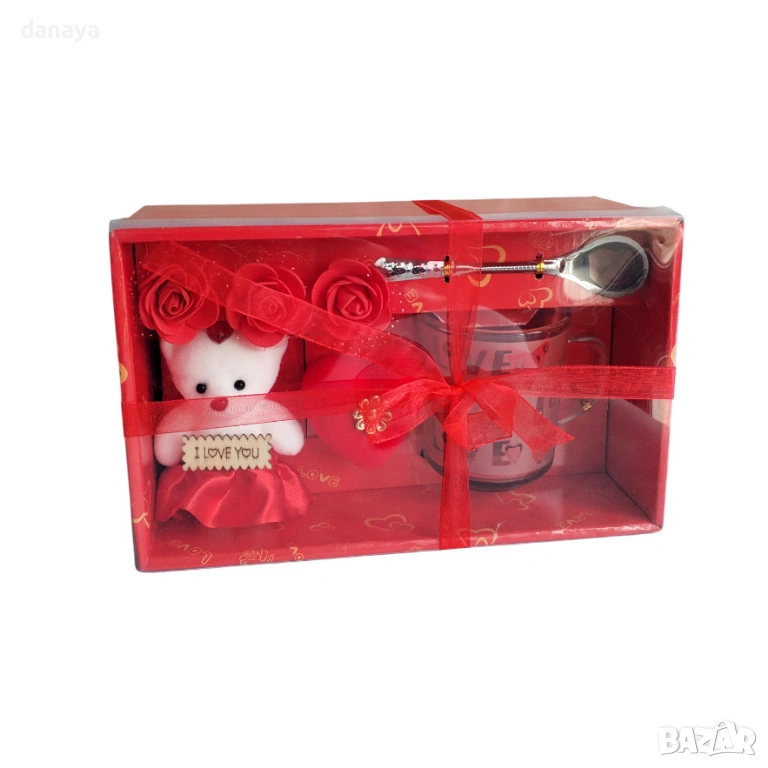 Подарък за Свети Валентин, романтичен подаръчен комплект с плюшено мече, чаша „LOVE“, лъжичка, сърце и декоративни розички.
