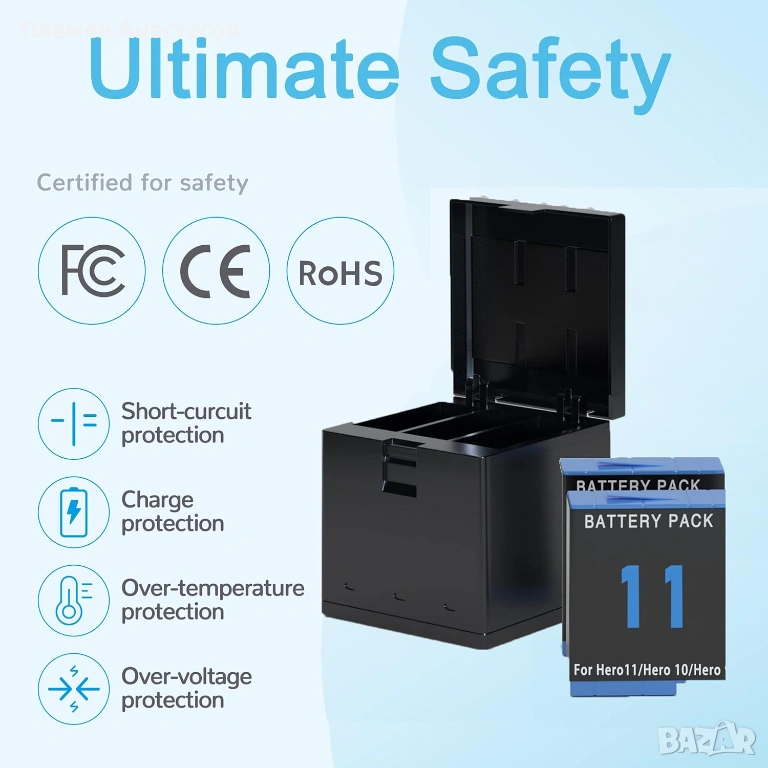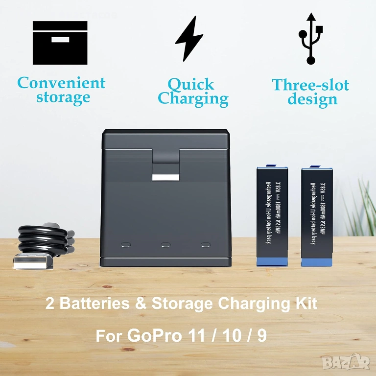 Практичен комплект от 2 презареждаеми батерии и 3-канална зарядна станция, съвместим с екшън камерите GoPro Hero 9, 10, 11, 11 Mini и 12 Black. Идеално решение за по-дълги снимки, пътувания и приключения, когато ви е необходима допълнителна автономност.