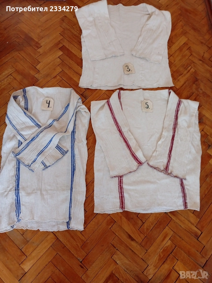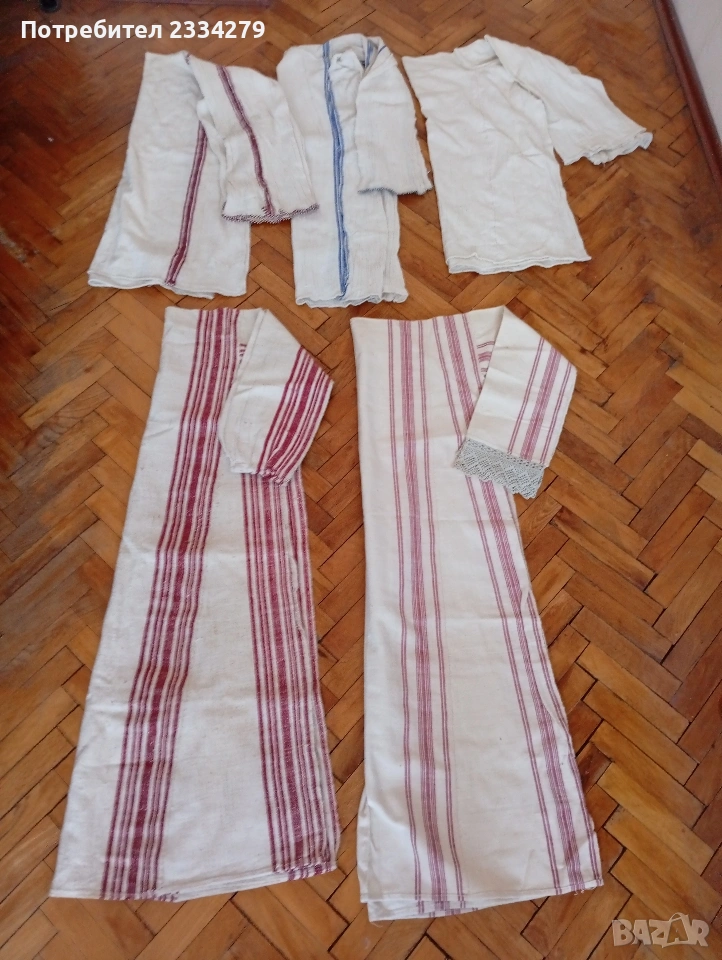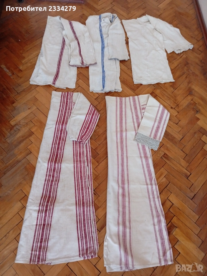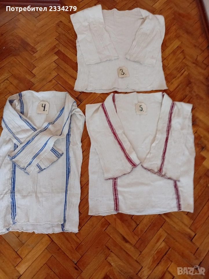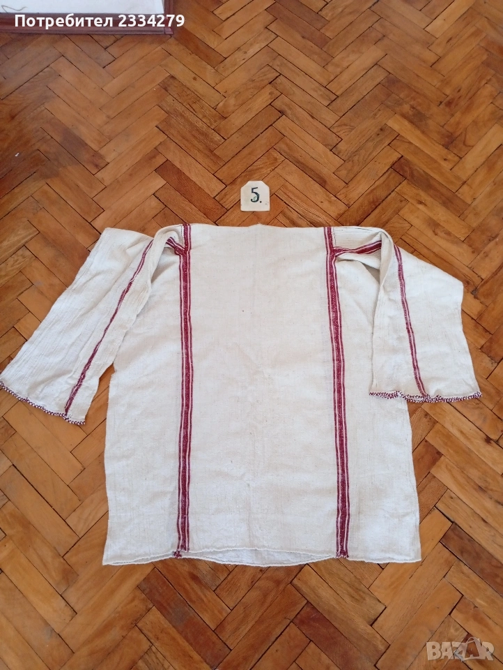 носия например като сукманската или сената носия, може да се носи и самостоятелно с престилка и елек. Изработена от домашно тъкан плат, бял/екрю цвят с вертикални червени тъкани ивици, размери с по-широките ивици: дължина 1м. 15см., рамена 40см., гръдна обиколка 1м.20см., цена 25€.; N:2 размери: дължина 1м.10см., рамена 50см., гръдна обиколка 1м.15см., цена 30€.; N:3 риза с размери: дължина 70см., рамена 37см., гръдна 1м.20см., цена 17€.; N:4 дължина 75см., гръдна 1м.20см., рамена 40см., цена 25€.; N:5 дължина 70см., рамена 40см , гръдна обиколка 1м.30см., цена 30€. Всичко не е използвано, приготвено за празници или чеизи в миналото,ръчно изработено от тъкан плат-,100% автентичност.
