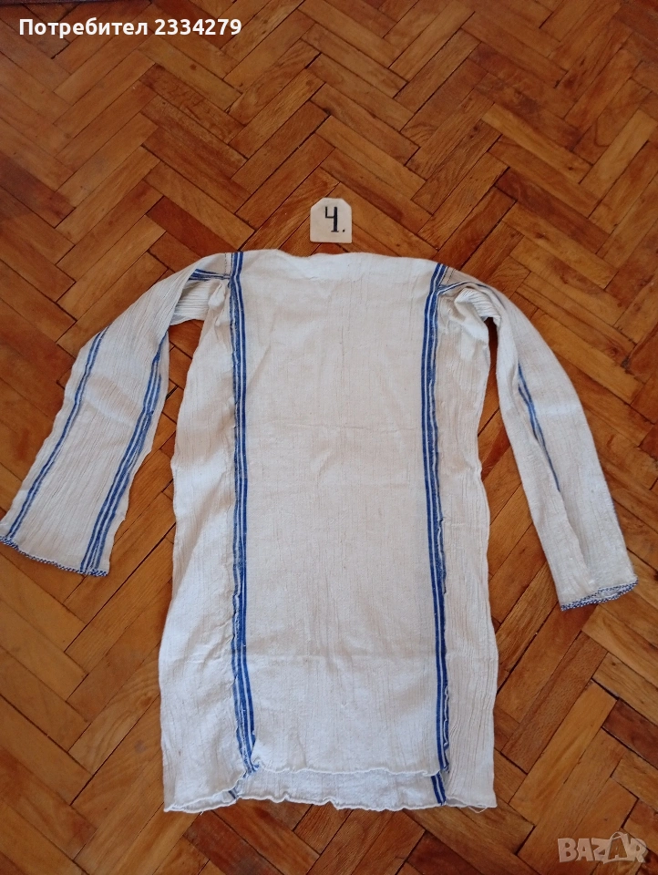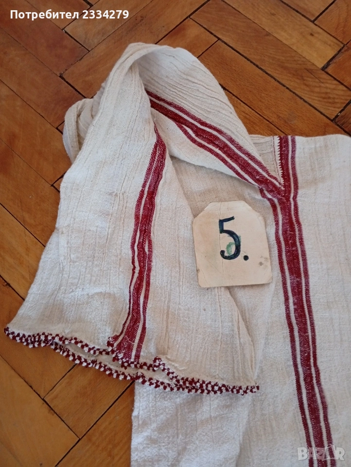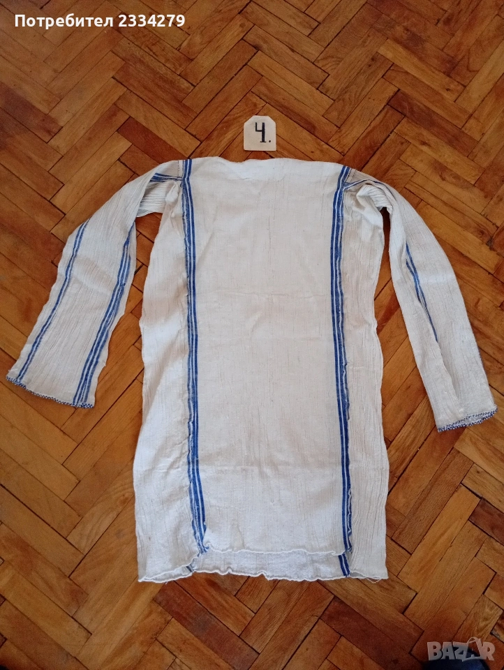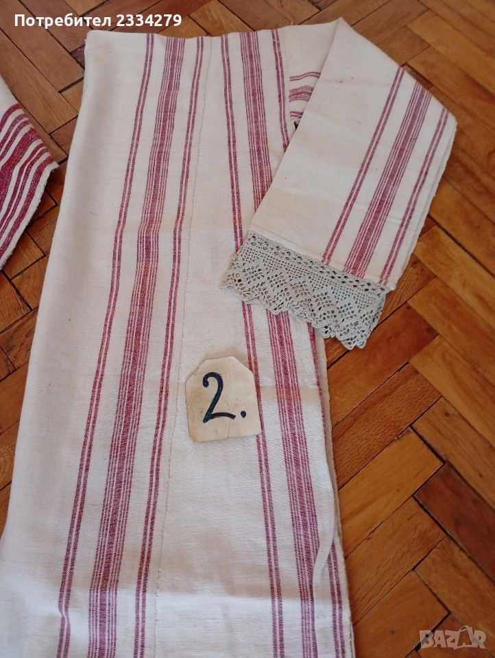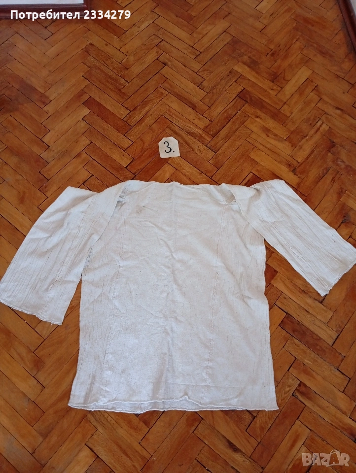носия например като сукманската или сената носия, може да се носи и самостоятелно с престилка и елек. Изработена от домашно тъкан плат, бял/екрю цвят с вертикални червени тъкани ивици, размери с по-широките ивици: дължина 1м. 15см., рамена 40см., гръдна обиколка 1м.20см., цена 25€.; N:2 размери: дължина 1м.10см., рамена 50см., гръдна обиколка 1м.15см., цена 30€.; N:3 риза с размери: дължина 70см., рамена 37см., гръдна 1м.20см., цена 17€.; N:4 дължина 75см., гръдна 1м.20см., рамена 40см., цена 25€.; N:5 дължина 70см., рамена 40см , гръдна обиколка 1м.30см., цена 30€. Всичко не е използвано, приготвено за празници или чеизи в миналото,ръчно изработено от тъкан плат-,100% автентичност.