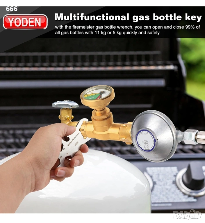 Многофункционален ключ за газови бутилки: нашият ключ за газови бутилки от неръждаема стомана с вграден отварач за бутилки, с който можете да отваряте и затваряте 99% от всички газови бутилки с тегло 11 кг или 5 кг бързо и безопасно.