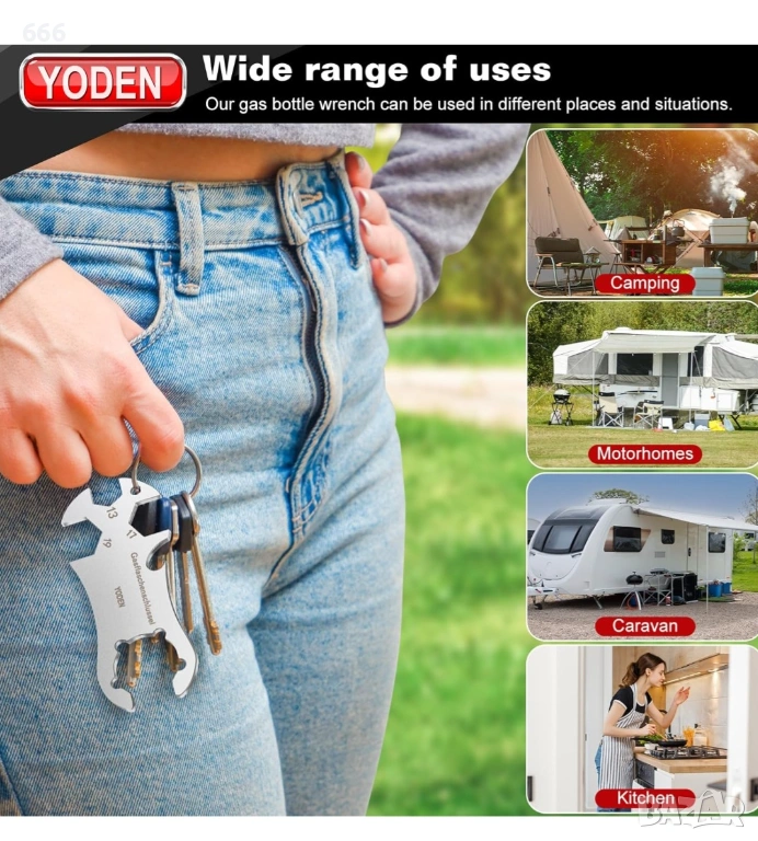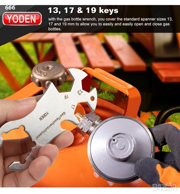 ИДЕЯ ЗА ПОДАРЪК Ключът за газови бутилки от неръждаема стомана е идеален подарък за любителите на барбекюта, лодки или кемпери/каравани. С нашия ключ за газови бутилки винаги сте готови да свържете газови бутилки или регулатори на налягането без никакви проблеми.