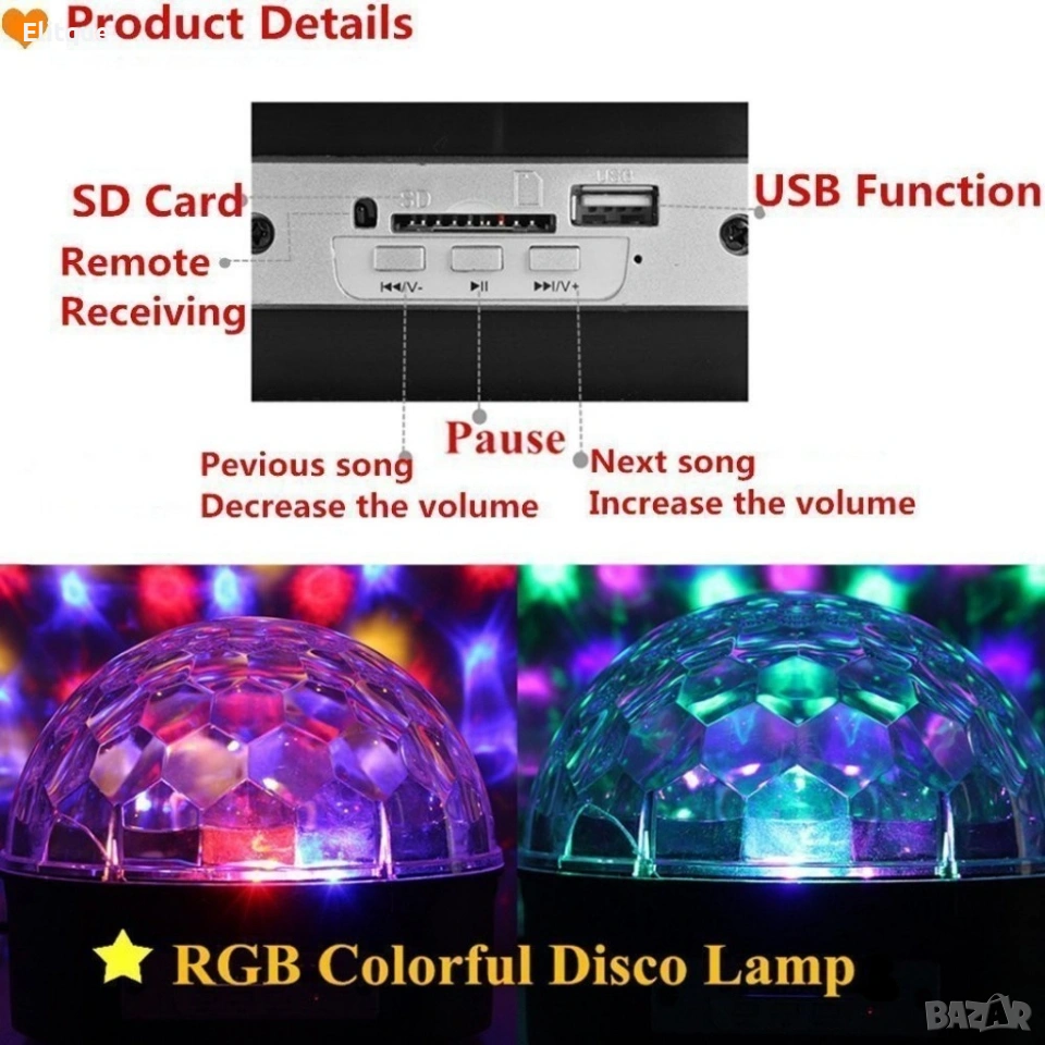 🎶💡 Диско LED лампа с дистанционно управление и USB флашка 💡🎶 Забавна диско LED лампа, която създава парти атмосфера у дома, в заведение или на празник. Работи с дистанционно управление и поддържа възпроизвеждане на музика чрез USB флашка. ✅ Предимства: Цветни светлинни ефекти Дистанционно управление Възможност за пускане на музика от USB флашка Подходяща за партита, рождени дни и събития Лесна за използване 🚚 Доставка: Изпращам с Еконт с опция преглед, до 3 работни дни.