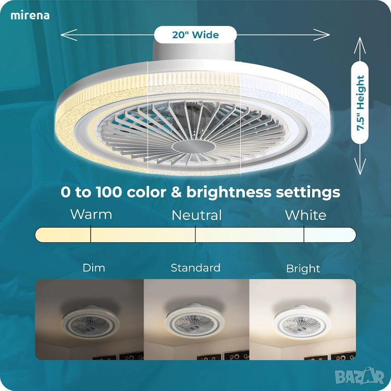 Вентилатор за таван с осветление - 50 см, 6 скорости, вентилатор за таван с осветление, управление с дистанционно управление - регулируема яркост/цвят, нисък профил, вентилатор за таван с осветление - 45W LED, таймер и вграден монтаж