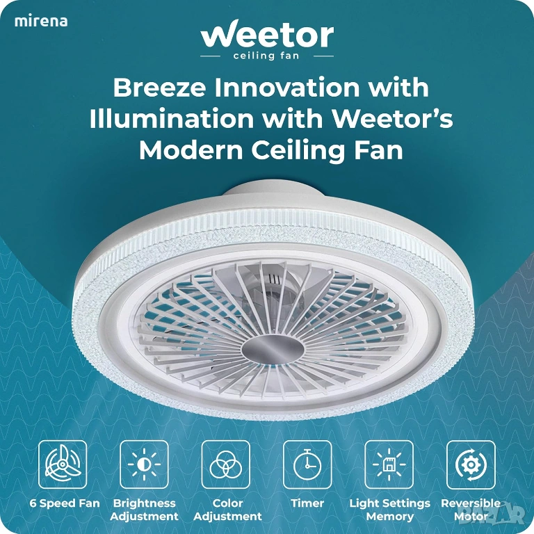 Вентилатор за таван ЛЕД LED осветление 50см 6 скорости дистанционно