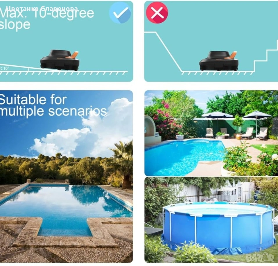 Универсална съвместимост с басейни: Независимо дали имате надземен или вкопан басейн без наклон, този робот за басейни е перфектният избор за вас. Той е подходящ за повечето видове басейни, включително PVC, винилови, мозаечни бетонни и фибростъклени басейни.