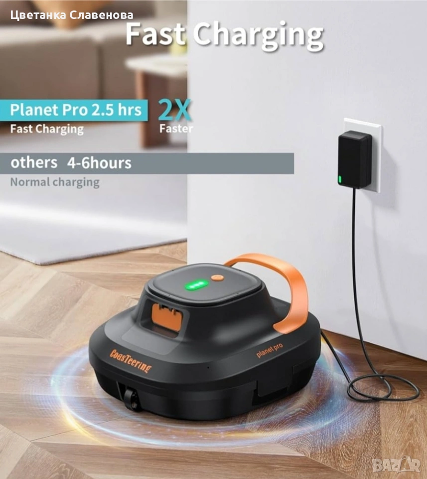 Безжичен робот за басейн: роботът за басейн CoasTeering е оборудван с мощна батерия от 4000 mAh, която позволява работно време от 120 минути. Само за 2,5 часа той се зарежда напълно и гарантира, че вашият плосък басейн с площ до 120 м² винаги ще изглежда като нов.