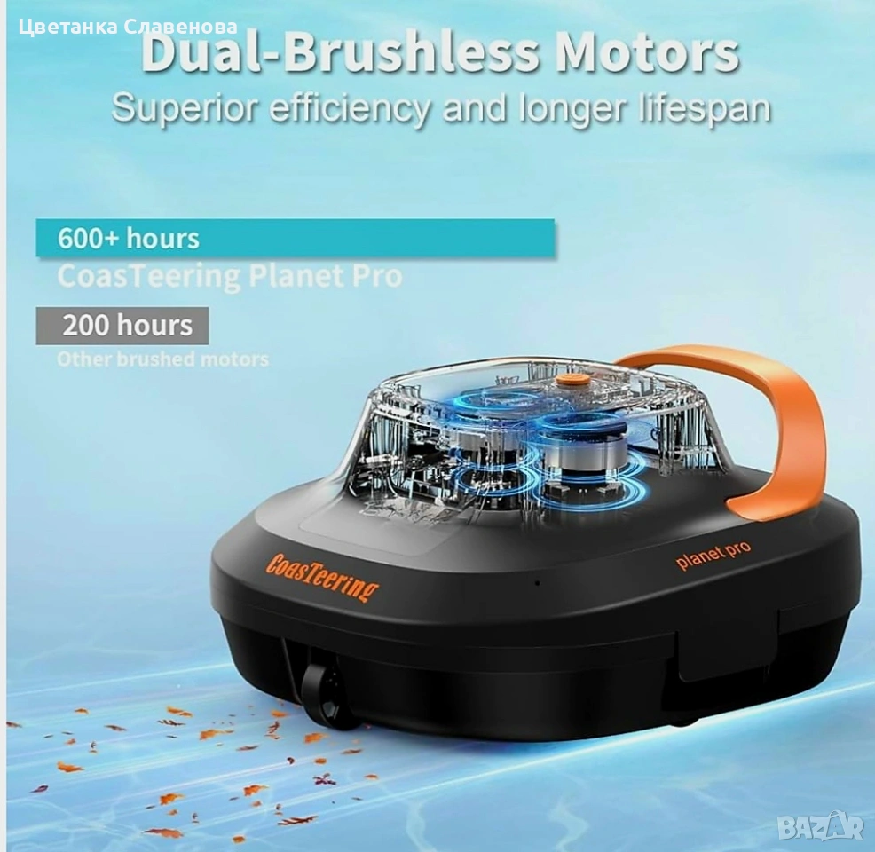Дълъг живот: Роботът за надземен басейн CoasTeering използва усъвършенствана технология с двоен безчетков мотор, която издържа до три пъти по-дълго от други устройства на пазара, използващи четкови мотори, осигурявайки дълъг живот и ефективност на почистване.