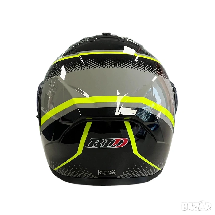 Вградени очила, затъмнени с 23% , които могат да свалят и вдигат само с едно движение на плъзгащия бутон от външната страна на каската.