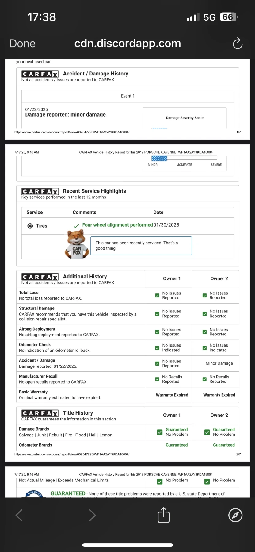 Porsche Cayenne 2019 Колата е напълно обслужена сменени всички масла и филтри, проверени агрегати, окачване и електроника. (смяна на 7500км). Моторът и скоростната кутия работят плавно и тихо, без никакви шумове или течове. Ходовата част е стегната и напълно безупречна. Екстри: Подгрев и обдухване на седалките вентилирани и отопляеми, с индивидуално управление за всяка седалка Двойна панорамна стъклена покривна система с електрическо управление и щора Lane Assist активен асистент за поддържане на лентата Porsche Assist система за безопасност, връзка и информация Park Assist + камера за заден ход с визуализация на екрана и автоматично спиране при препятствие Амбиентно LED осветление с няколко режима и цветови настройки Drive Mode Selector режими Comfort / Sport / Individual Електрическо отваряне и затваряне на багажника Keyless Entry & Start (безключов достъп) Мултимедия PCM с тъчскрийн, Bluetooth, USB, AUX, навигация и Apple CarPlay / Android Auto Климатроник с четири зони Мултифункционален волан с управление на системите Електрически регулиране на седалки с памет и лумбална опора Оригинални 20 алуминиеви джанти с всесезонни гуми Michelin Допълнителен комплект 22 Porsche Sport Design джанти включен в цената и др. Целият автомобил е полиран и пастиран професионално, без забележки по боята Фаровете са полирани и защитени с PPF фолио Вътрешните елементи навигация, километраж, лайсни, скоростен лост са покрити с предпазно фолио за защита от надраскване Интериорът е в перфектно състояние, без следи от употреба, петна или миризми Кожата е като нова, поддържана редовно с професионална авто козметика Всички бутони, сензори и електронни системи функционират безупречно CarFax