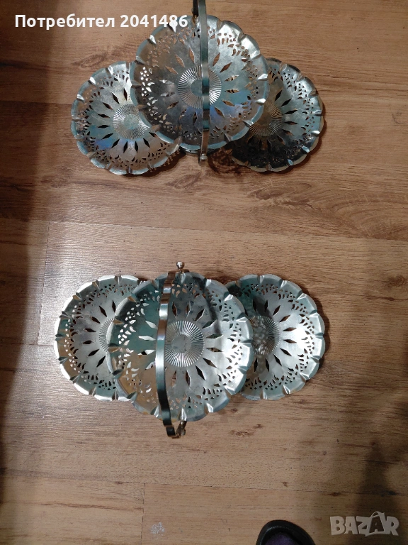 2 броя сгъваеми подноси за сервиране соленки,сладки,хляб и др.Направени са от неръждавейка и са в много добро състояние.Моля прегледайте и другите ми обяви.Цената е за брой.