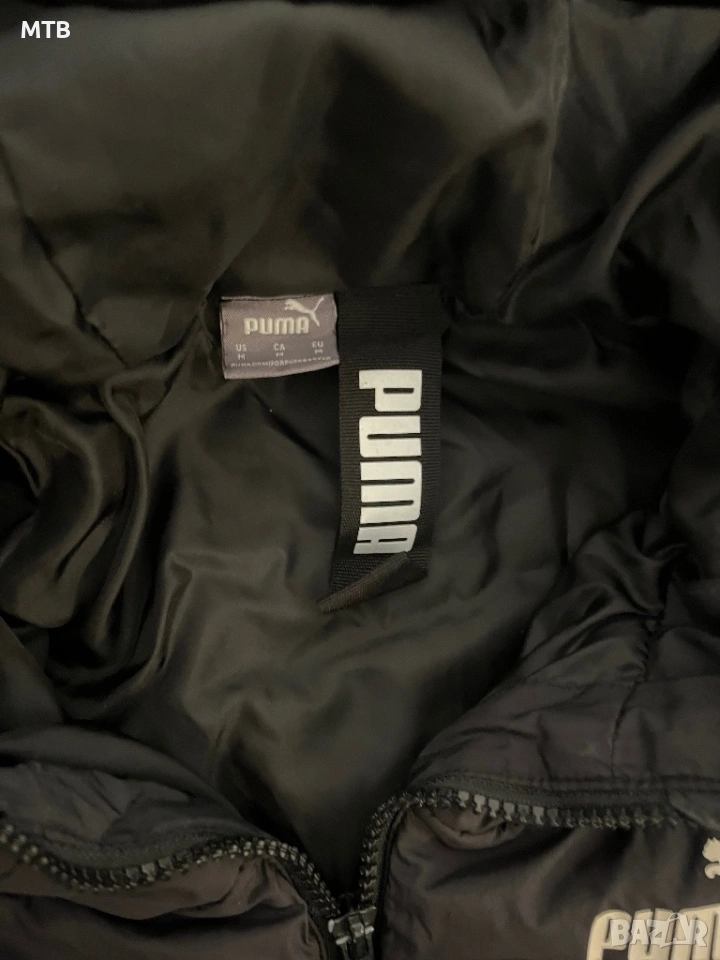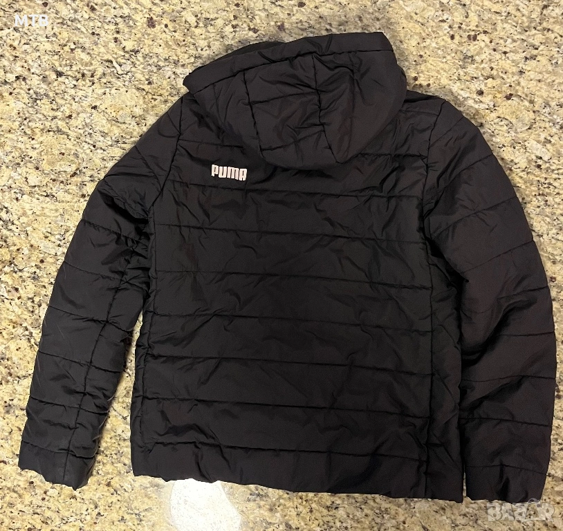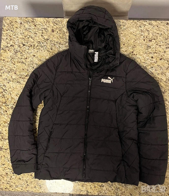 - PUMA Чено яке Леко и много удобно яке Висококачествена силиконова вата Голяма качулка Два странични джоба с цип Бяло лого на марката в предната и задната част на якето Размер M Без забележки Обличано е само веднъж