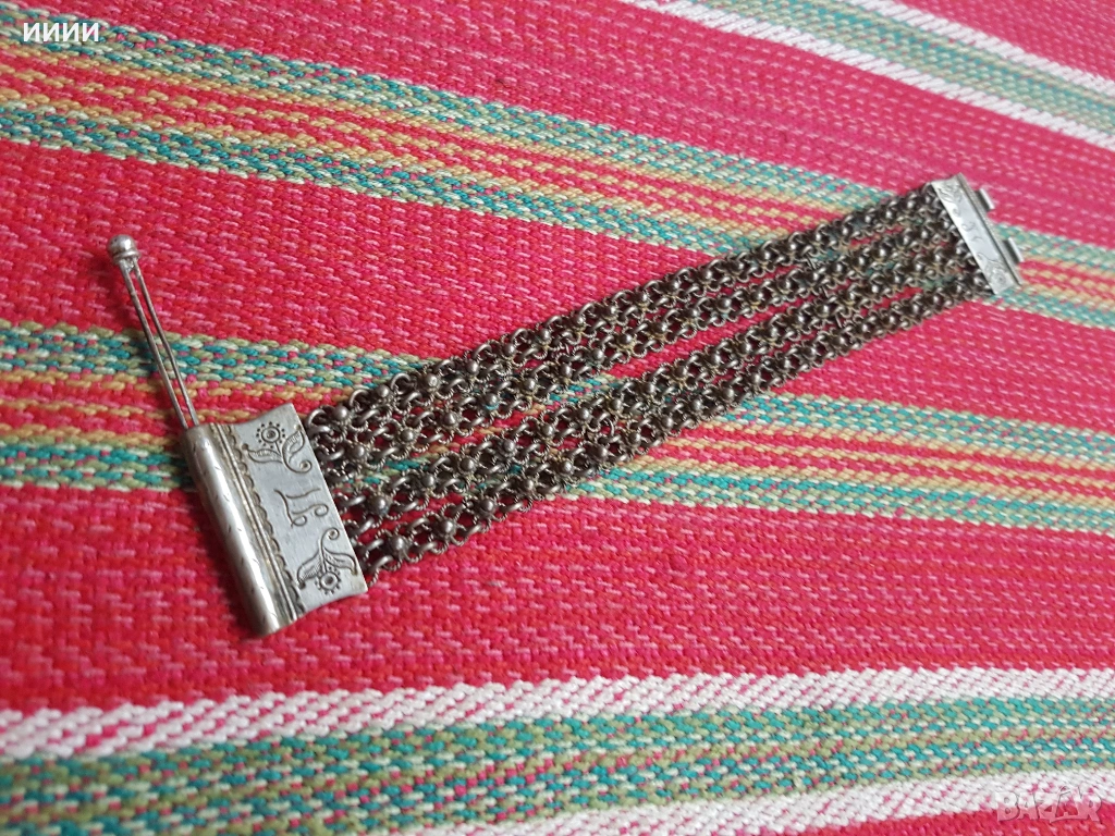 Ръчно изработена от сребро през втората половина на 19-ти век. Със здрава закопчалка, запазена и здрава, без никакви забележки. Дължина 18 см.