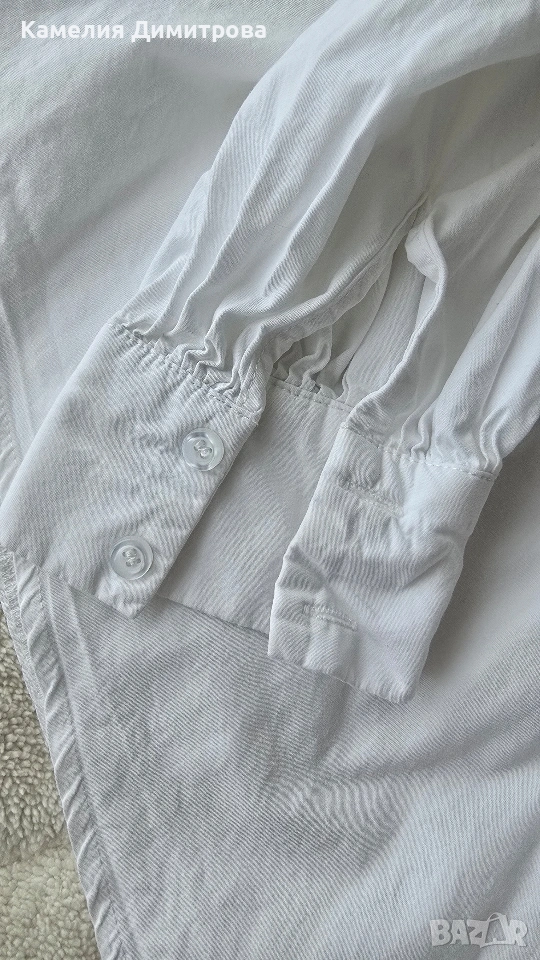 Стилна бяла риза с нестандартна кройка, която стои много по-ефектно от обикновена класическа риза.