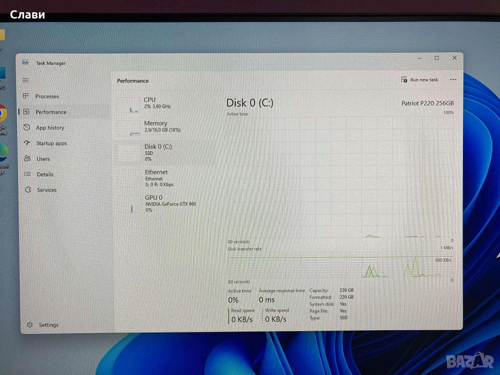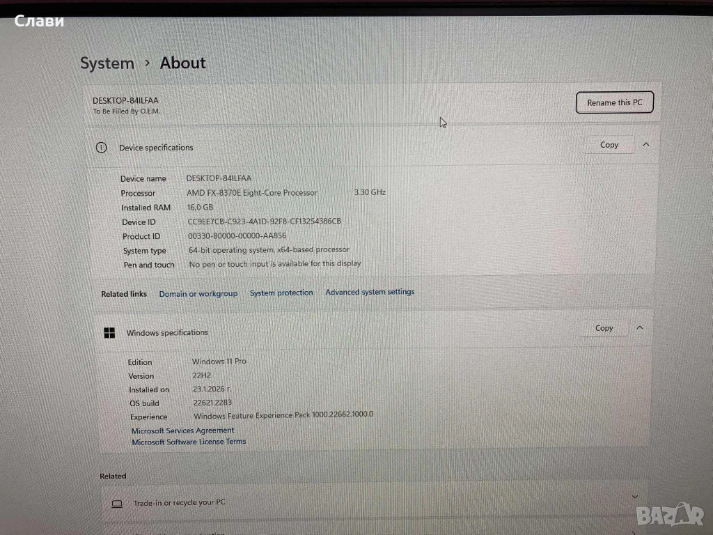 Операционна система: Microsoft Windows 11 PRO 64 bit - активиран; Инсталиран офис пакет 2010, ADOBE и най необходимите програми за работа.