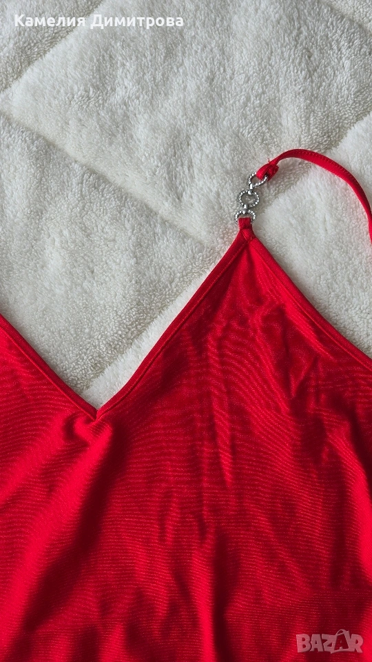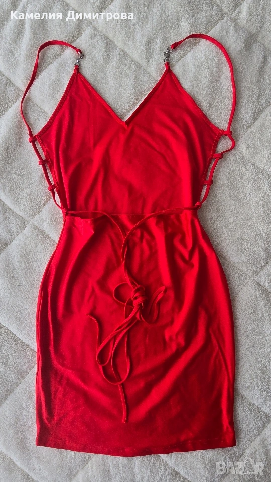 Моделът е с тънки презрамки и изчистено деколте, а отстрани има декоративни ленти, които придават по-дързък и модерен вид. В областта на талията има връзки, с които може леко да се регулира и оформя силуетът. Дължината е къса, кройката е по тялото и създава много женствена визия.