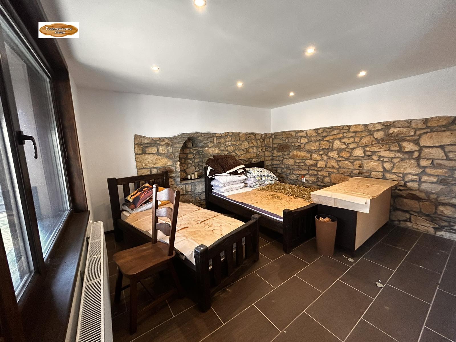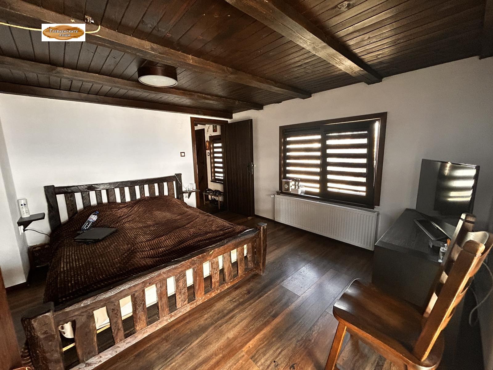 Обзавеждане: Продава се с цялото обзавеждане, включващо ръчно изработени дъбови мебели и ковано желязо.