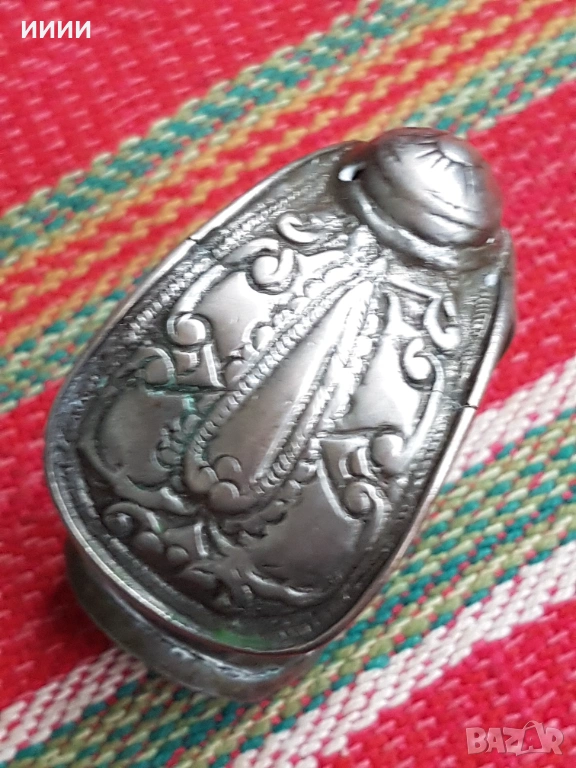 Изработена от ковано сребро през втората половина на 19-ти век. От едната страна има сцепване и е попълнена, със сребърен припой. Тежи 71,40 гр. Продавам я, като материал. Пробата е 600, превърнато в 925 по фиксинга за деня прави 99€.