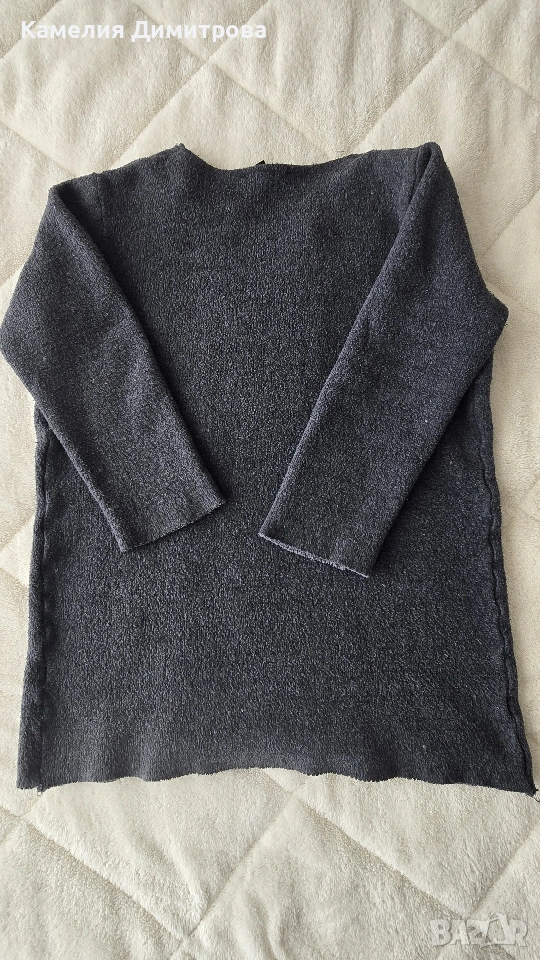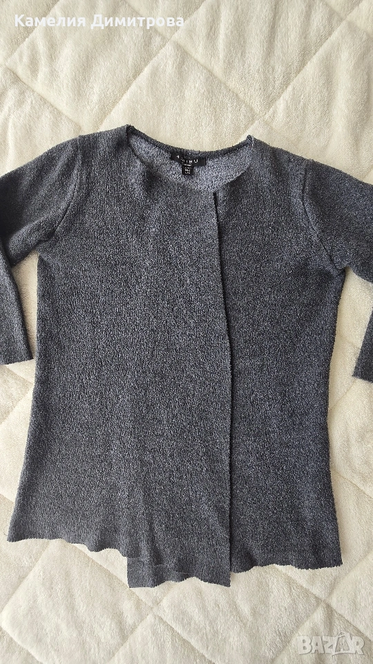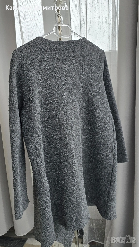 Моделът е без закопчаване, с падаща предна част и мека, релефна плетка, която придава уютен и модерен вид. Ръкавите са 3/4 дължина, което го прави удобно за носене през пролет, есен или през зимата. Цветът е тъмносив и лесен за комбиниране с дънки, рокли, поли или офис облекло.