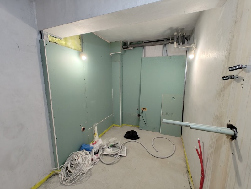 Къщата е на подова замазка и фина шпакловка подготвена за боядисване