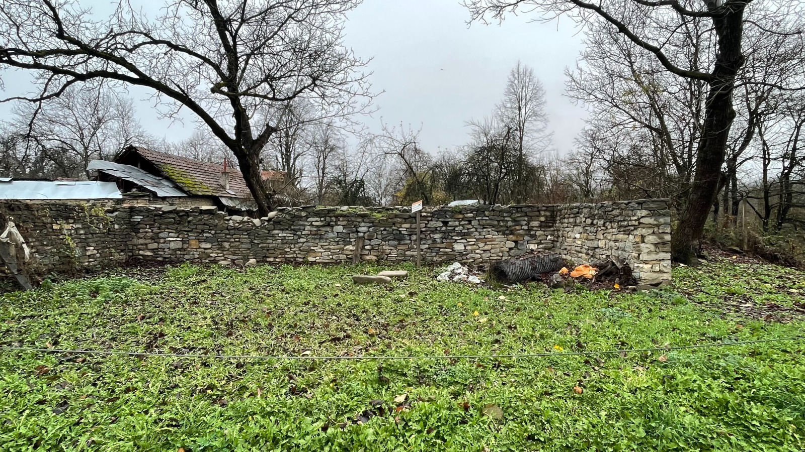 от едната страна имотът е ограден с масивен каменен зид, върху който е разположена постройка тип сайван , също от камък;