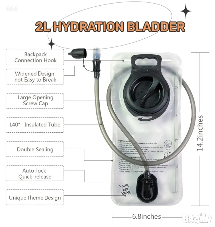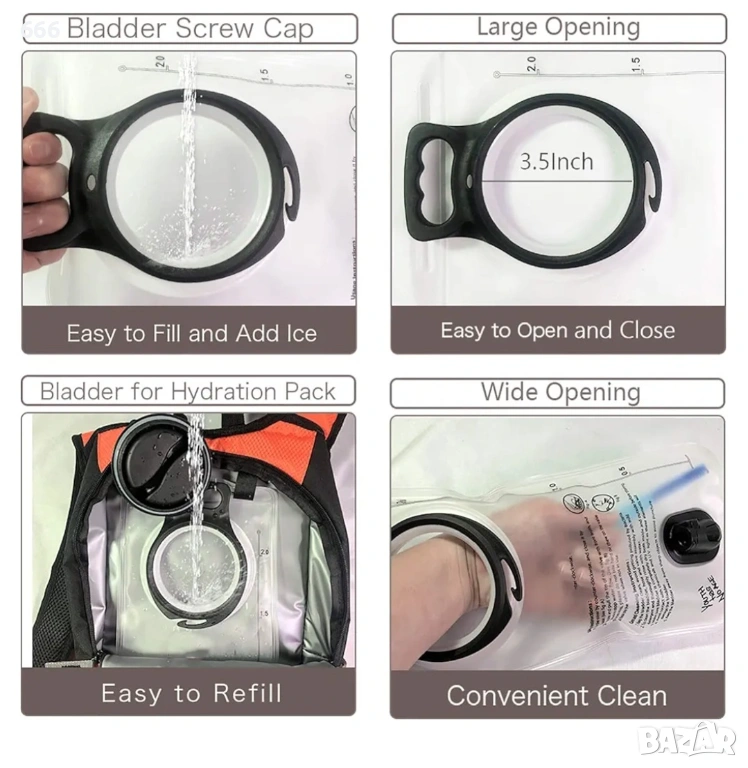 Лесен достъп: Нашият резервоар за хидратация се гордее с най-големия отвор на пазара, което позволява лесно наливане и достъп за почистване. Изолационната му функция позволява на водата да устои на температурните промени, така че можете дори да добавяте кубчета лед директно от хладилника си.