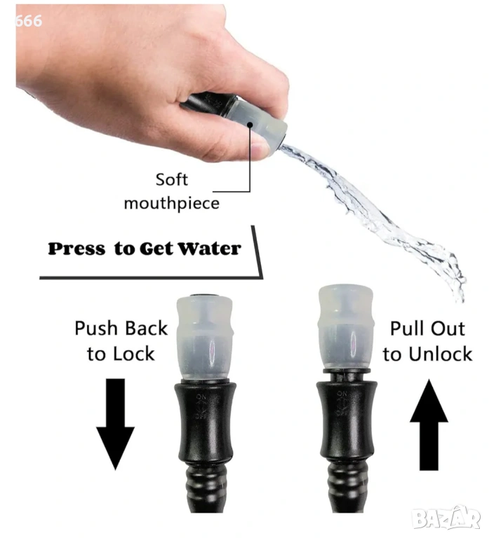 Дизайн, устойчив на протичане: Мекият, но издръжлив мундщук на нашия хидратиращ резервоар с клапан ON/OFF предотвратява протичане, а бързо освобождаващата се тръбичка може да се отдели за лесно почистване. Функцията за автоматично изключване гарантира, че резервоарът остава пълен и не протича, дори когато тръбичката е извадена. Прахозащитният капак предпазва мундщука от замърсявания и отломки.