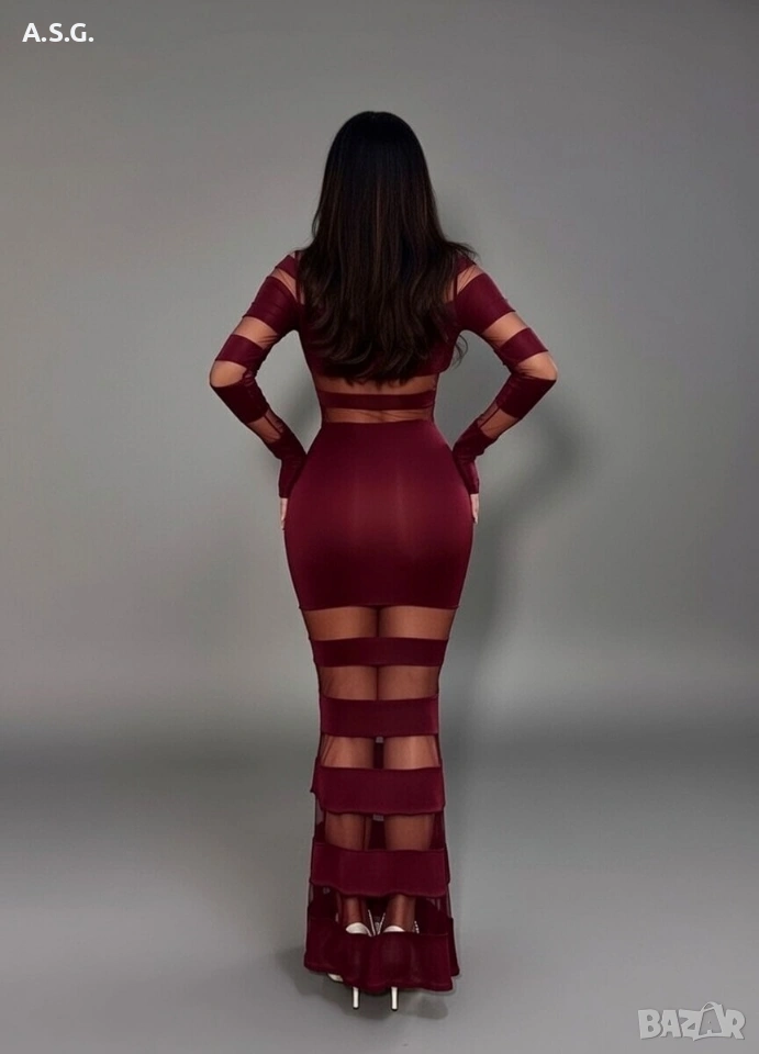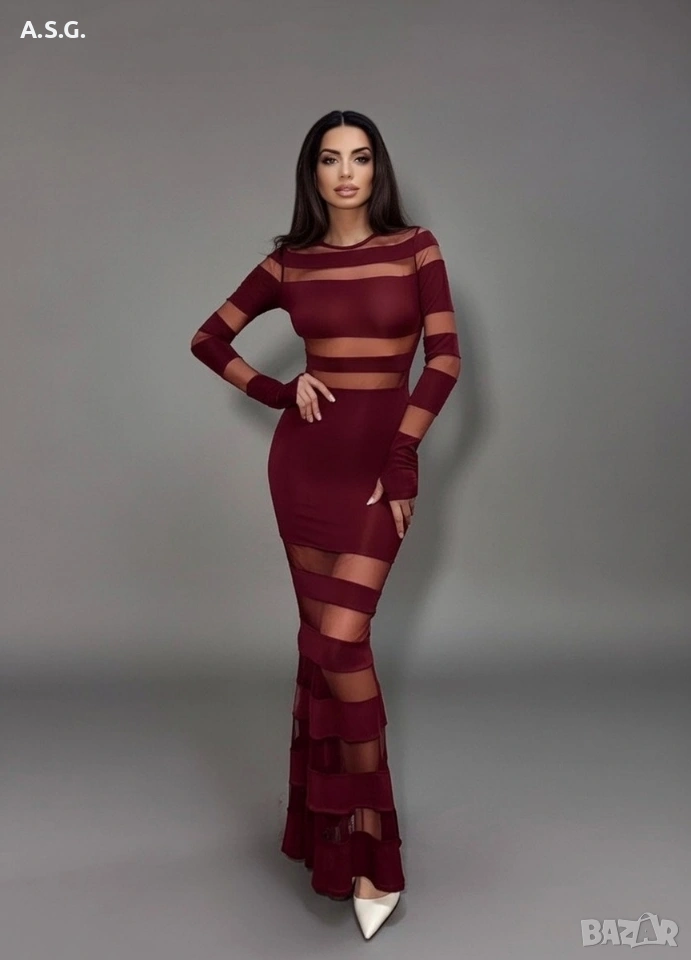 Чисто нова дълга рокля с елегантни прозрачни детайли в цвят бордо