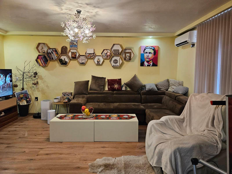 Жилището е модерно и функционално, направено висококачествени материали. Обзаведено и оборудвано с уреди висок клас. Състои от голям дневен тракт - хол, столова и кухня, две спални, голяма баня, тоалетна, килер и тераси. Подовата настилка е теракот и ламиниран паркет.Стени и таван - венецианска мазилка, Дограмата е РVС - златен дъб, стъклата - 'четири сезона'. На Едната терасата е изнесена част от кухнята. Отоплението е на газ и климатици, има изградена отоплителна инсталация с чилър. Външна изолация.