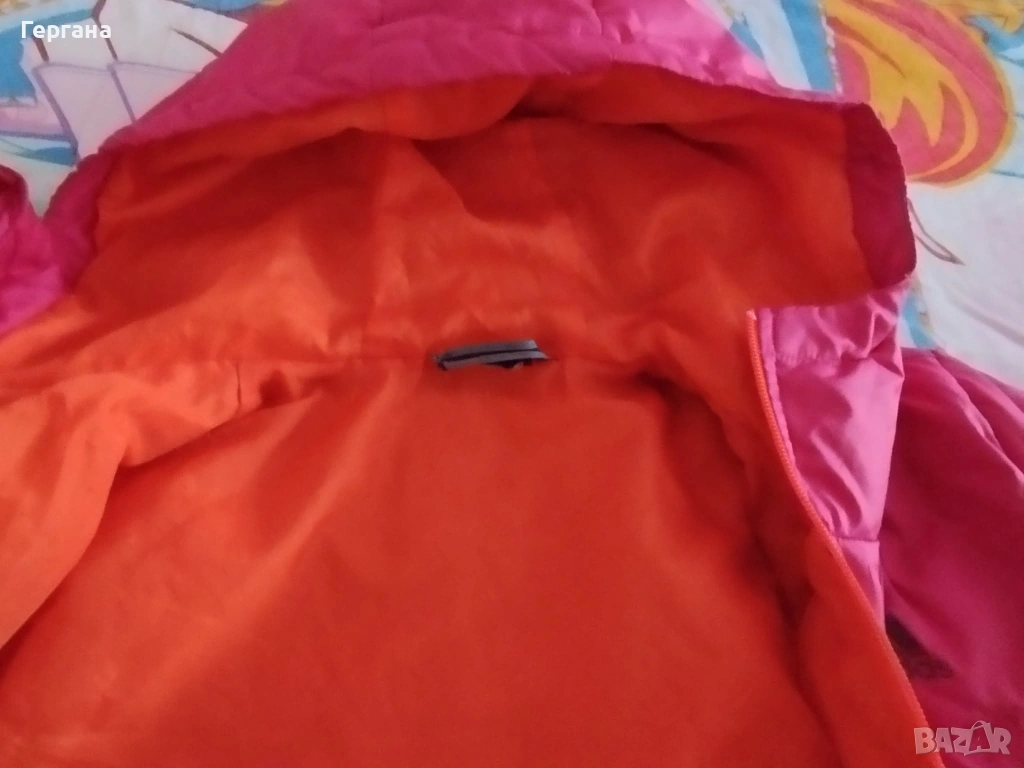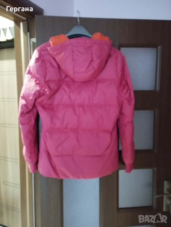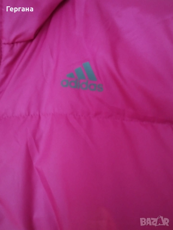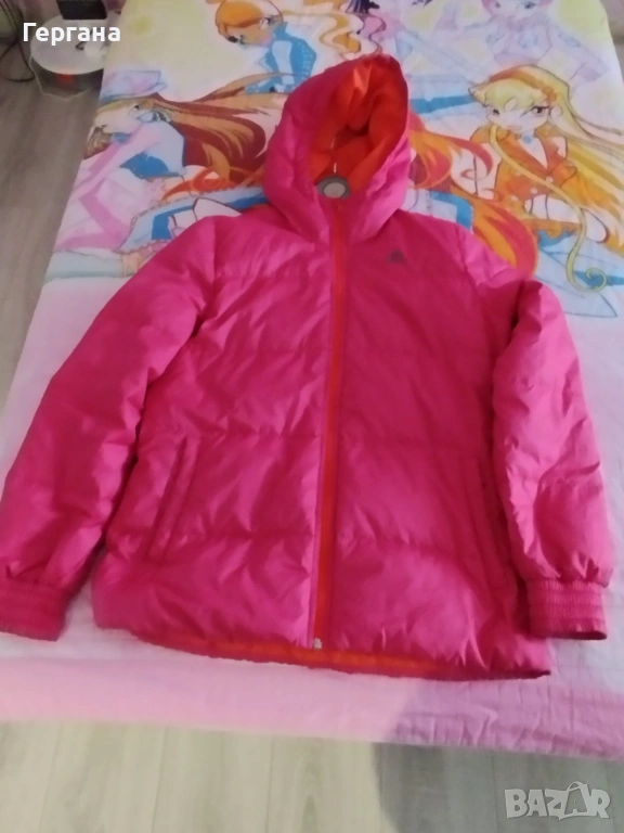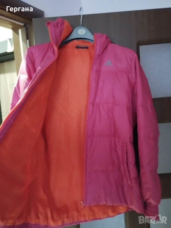 Красиво и топло яке на Adidas – L, с гъши пух. Размерите му са следните: дълго е 70 см., дължина на ръкава от рамото 64 см., ширина под гърдите (едностранно) 54 см. Цвят – цикламен с оранжев хастар.