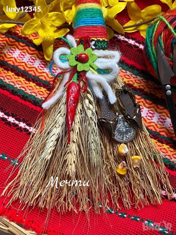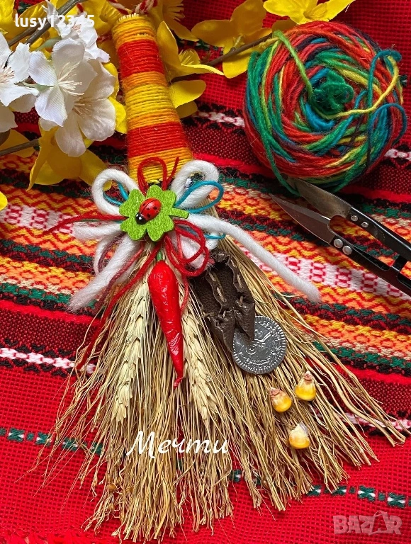Весели първомартенски метлички за здраве и усмивки на всички! Декорирани метлички с вълнена прежда, шевица, зрънца от царевица, цървулки, житни кълнове с връвчица за закачане. 🌶🌾🐞🍀🍀🍀🐞🤍💚❤️ Размери; 21см./12см. Метлата е символ на новото начало на пролетта, здравето, щастието и радостта.