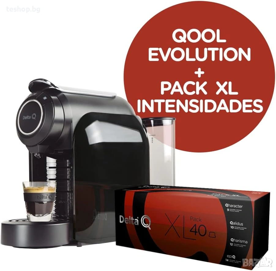 Съдържание: този пакет съдържа 1 кафемашина Q Evolution в черен цвят и 10 капсули epiQ, 10 Qharisma, 10 Qalidus и 10 Qharacter.